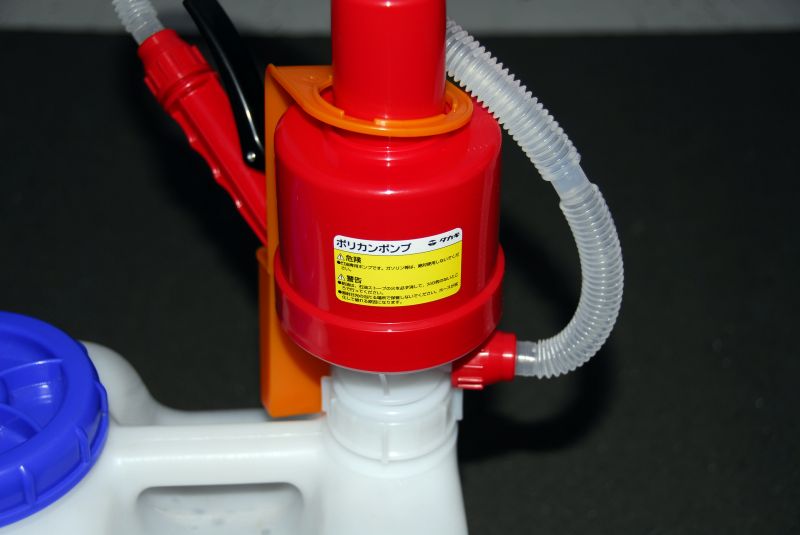 10Lポリタンク(飲料水)にセットした手動ポンプ(980円)