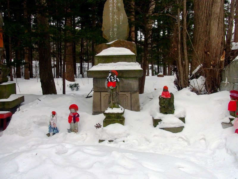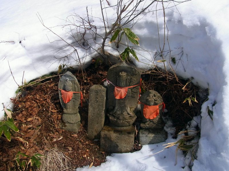 お地蔵様の中には、周囲の雪が融け始めているものがあり