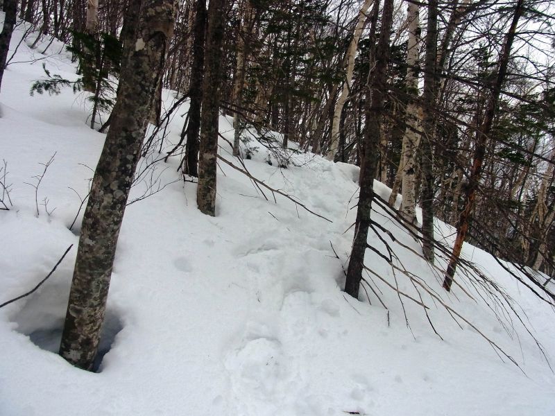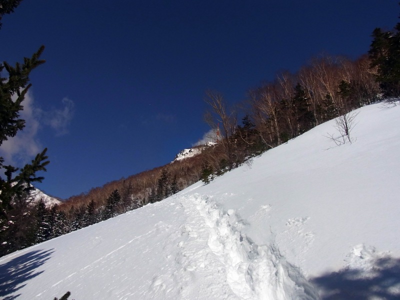 気温が上がっているので、雪は緩んできていますが、登山道は踏み固められているので、まだ踏み抜くことはありませんでした。