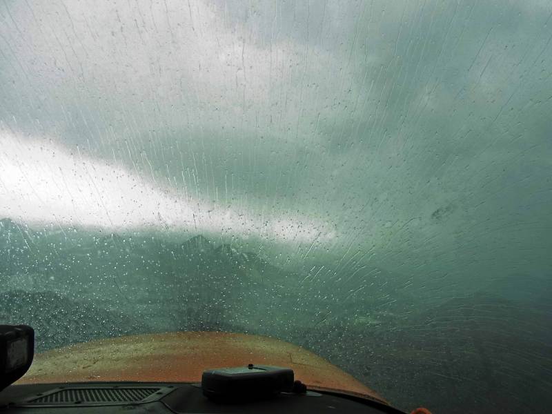 大粒の雨が、フロントガラスにたたきつけられます。