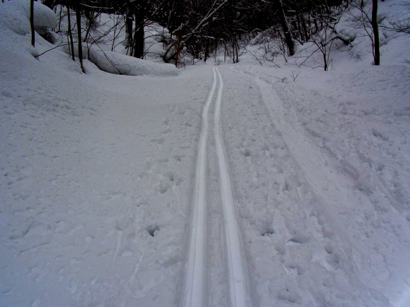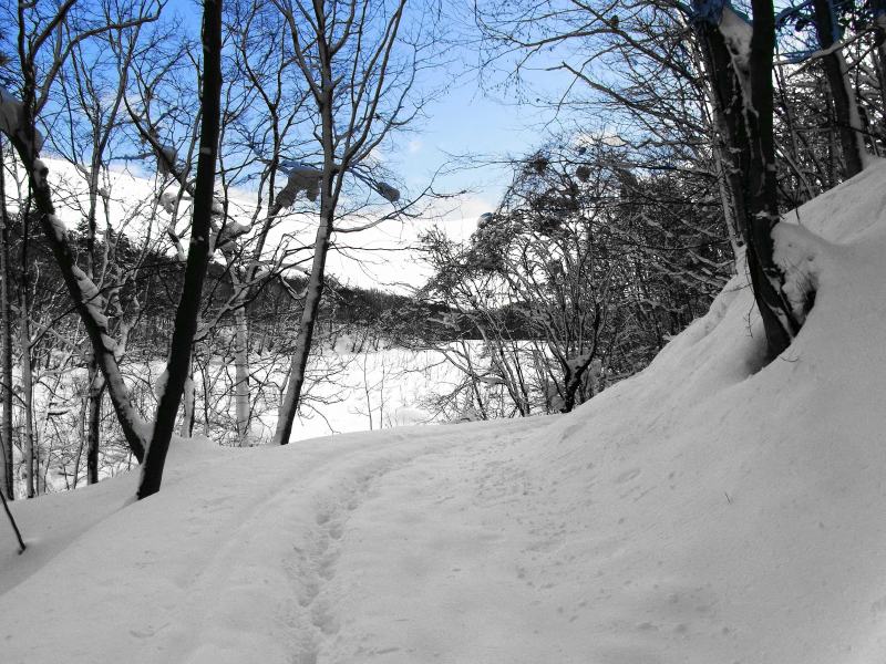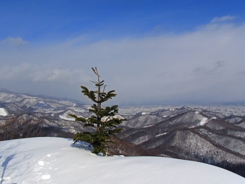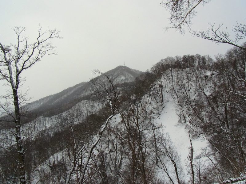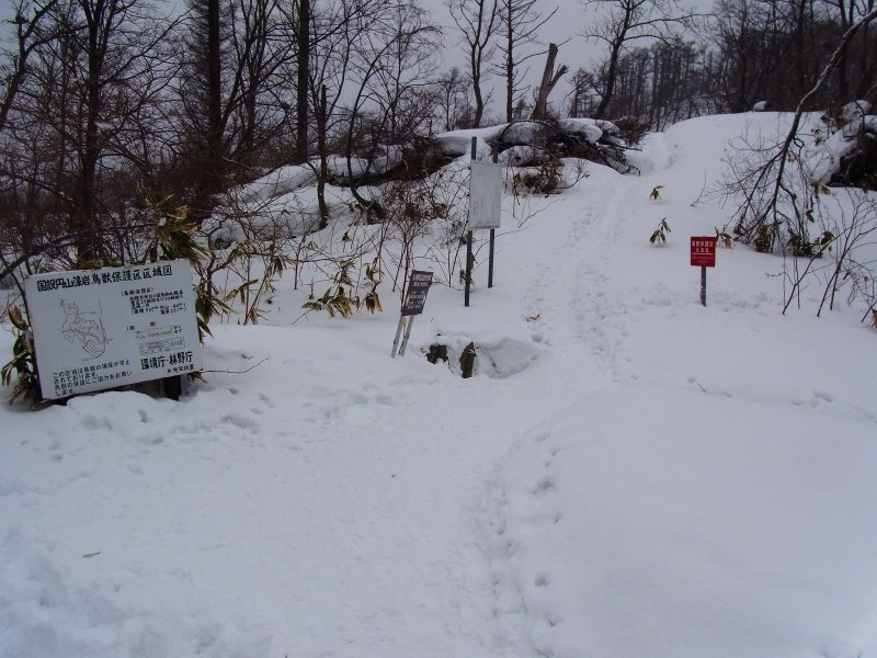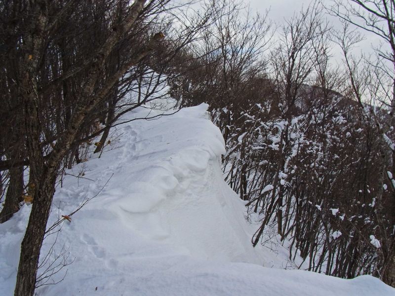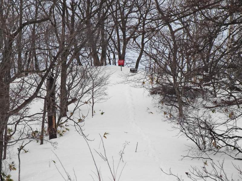 何時も直登している急斜面のひとつでは、新雪が深くて時間が掛かりそうだったので、傾斜の比較的緩い夏道コースを歩いてピークまで登りました。
