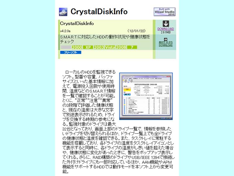 ソフト名は、「CrystalDiskInfo」で、結構有名なフリーソフトです。