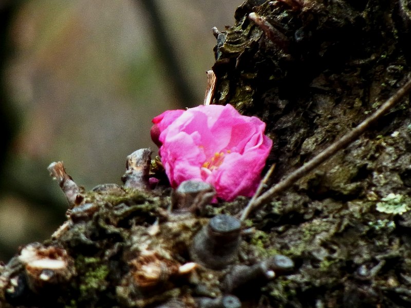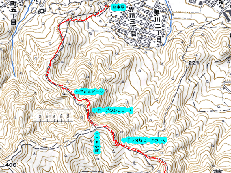 自宅で、その付近を撮影した写真を調べたら、登山道の入口そばにある木の上の方に、少量のピンクテープが残っていました。