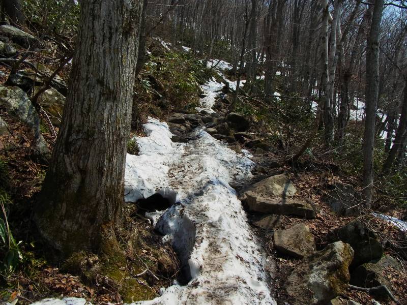 雪の減り方が早いため、前日の踏み跡が完全に消えており、前方を見ても登山道らしきものやピンクテープが無いため、歩いていても少し不安でした。