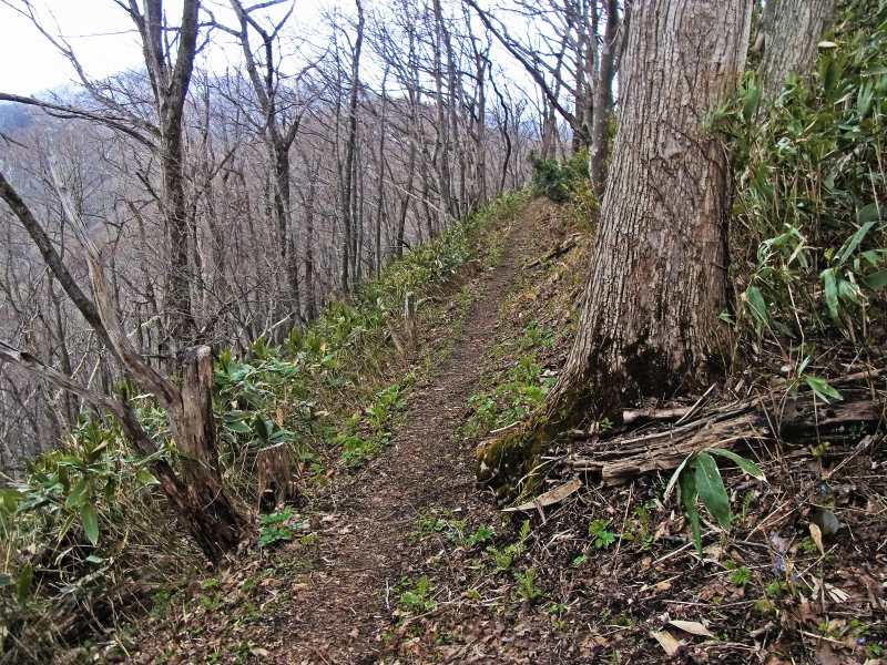 斜面を登り切り稜線に出ると登山道の両脇が笹になりますが、現在笹が身体に触るようになっています。