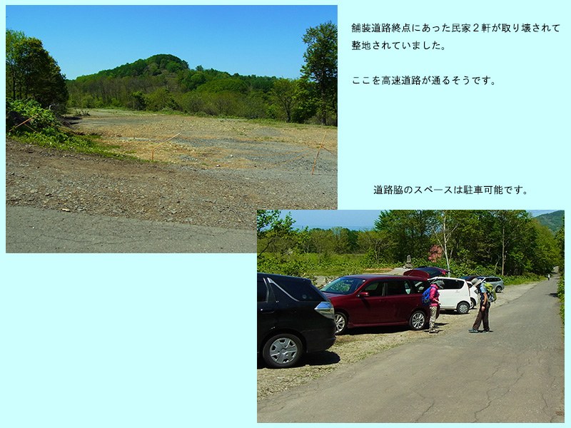 舗装道路の終端に民家が2軒あり、その付近が駐車スペースになっていましたが、この民家2軒は取り壊されて、跡地は整地されていました。