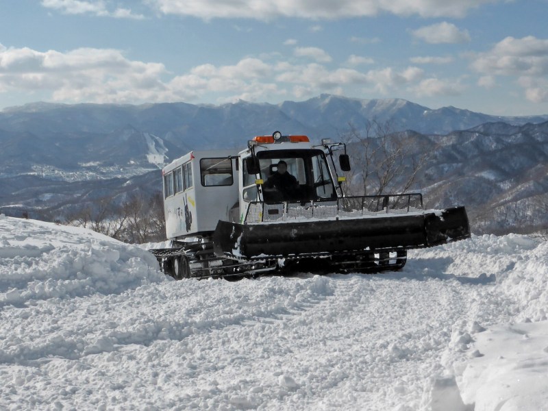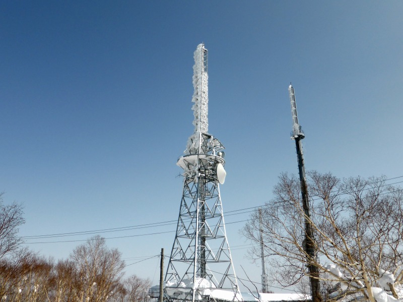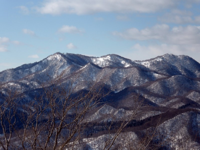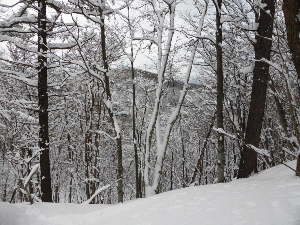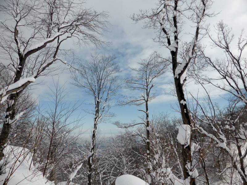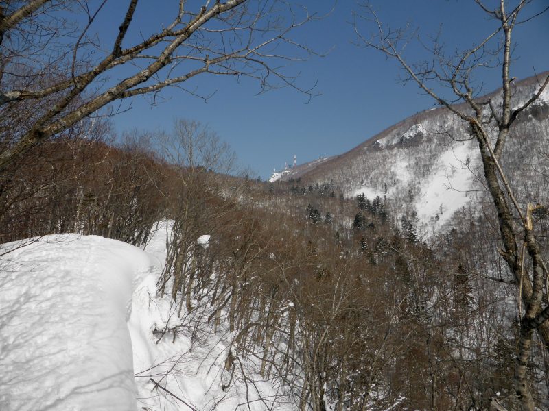 気温が上がってきたため、遠方視程はやや不良でしたが、山頂から見える近くの山の斜面には、スキーの跡が残っていました。