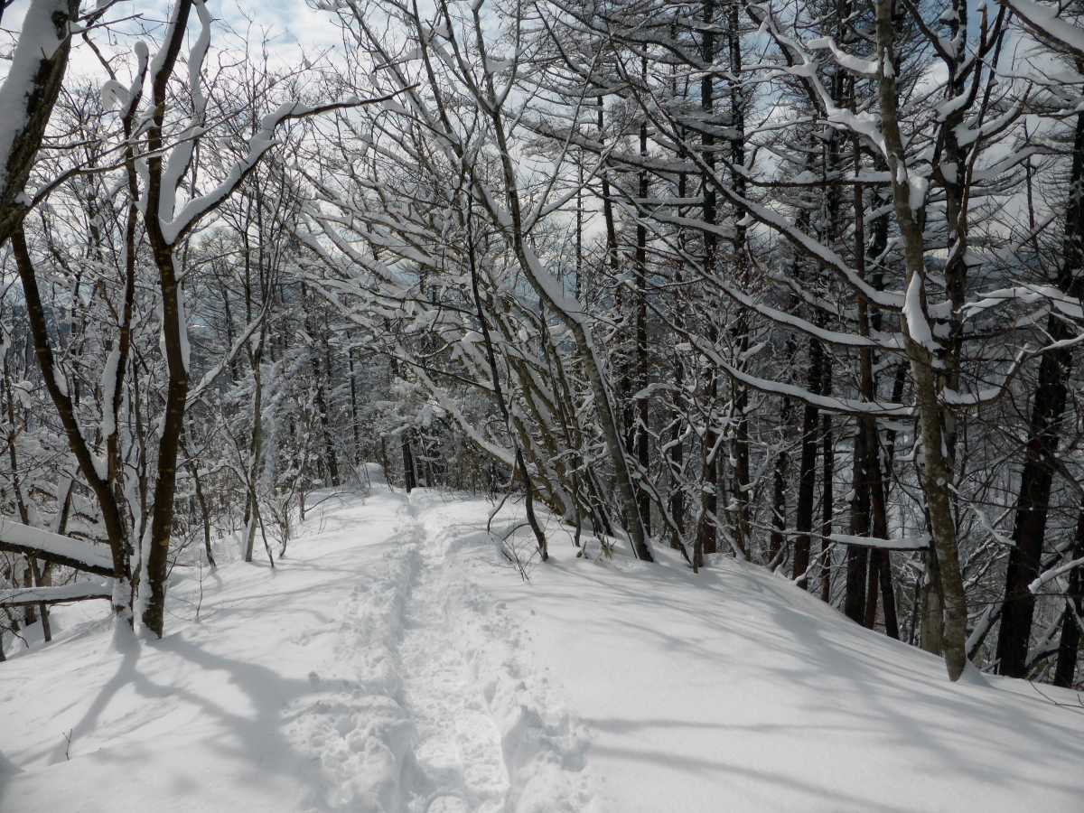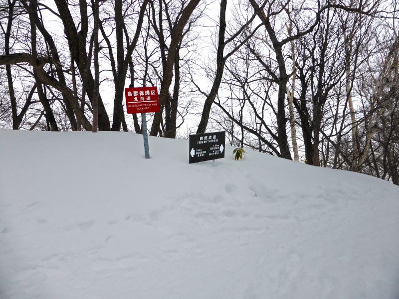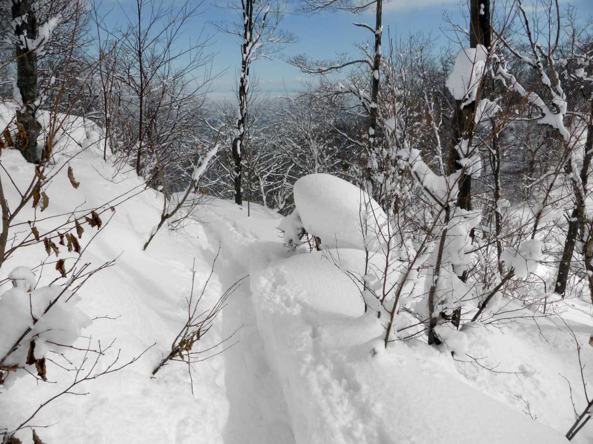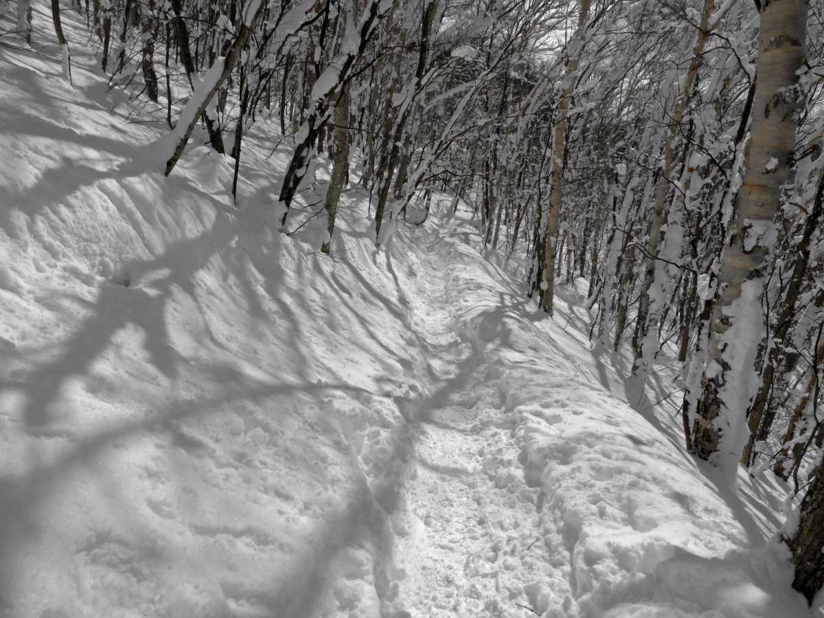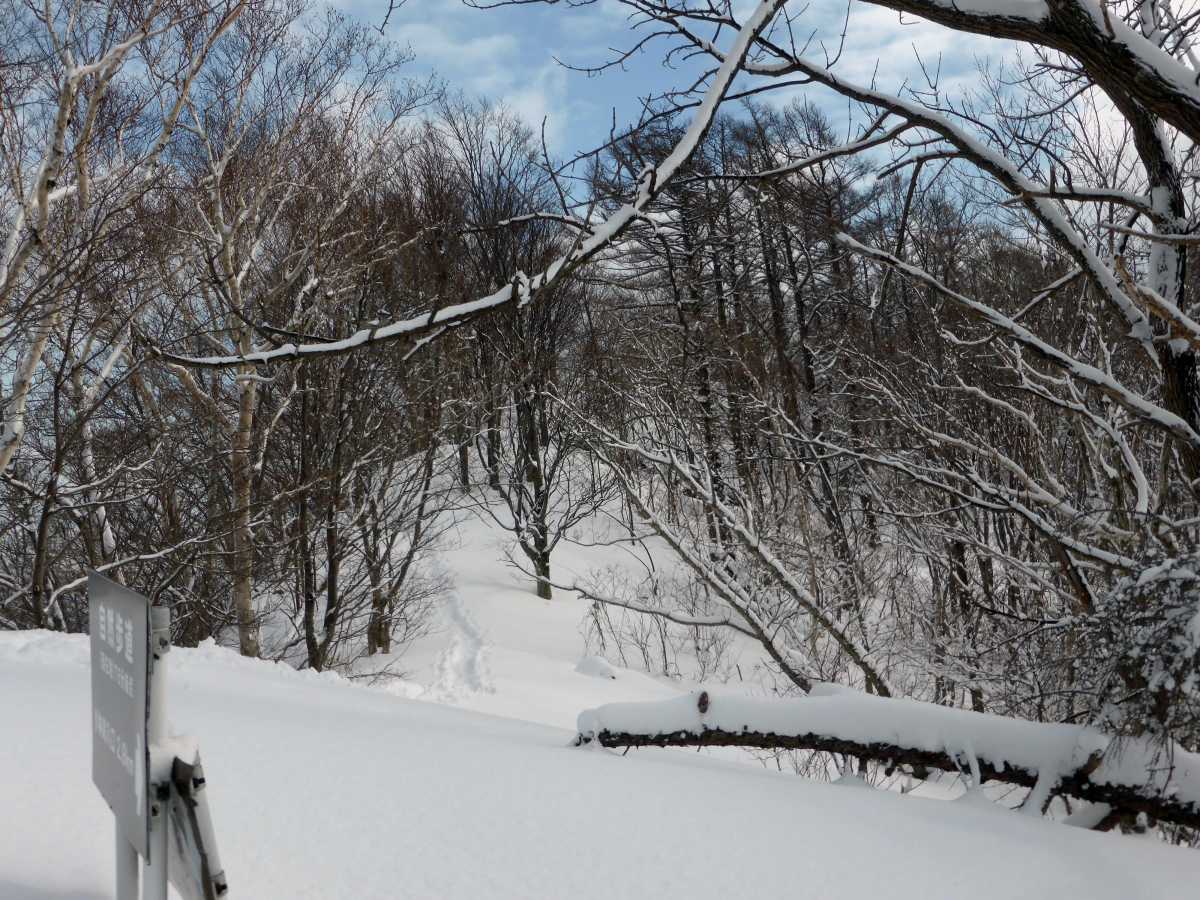 今日の登山道の状態は、暫く降雪が無かったようで、冬道の急登部分とガレ場では、スノーシューの踏み跡が広範囲に広がり、藻岩山についている様な凹型の踏み跡が全くない状態でした。