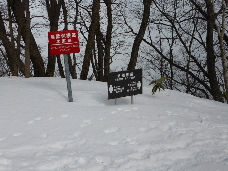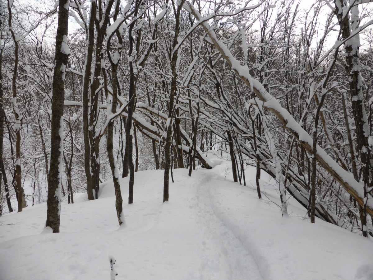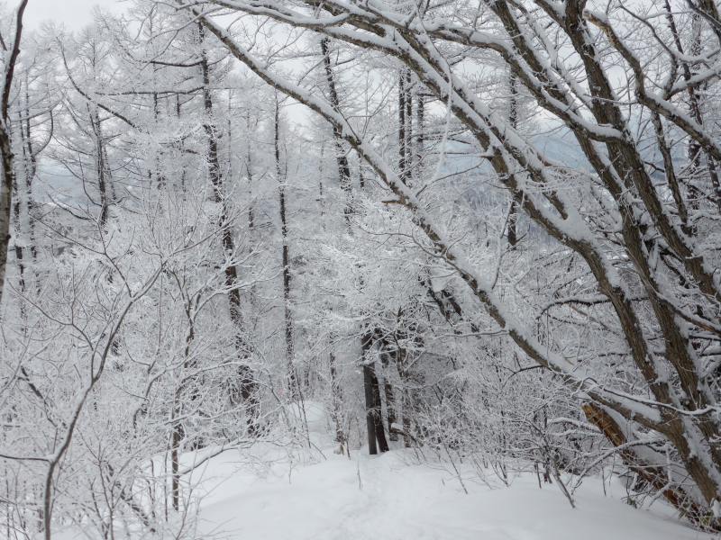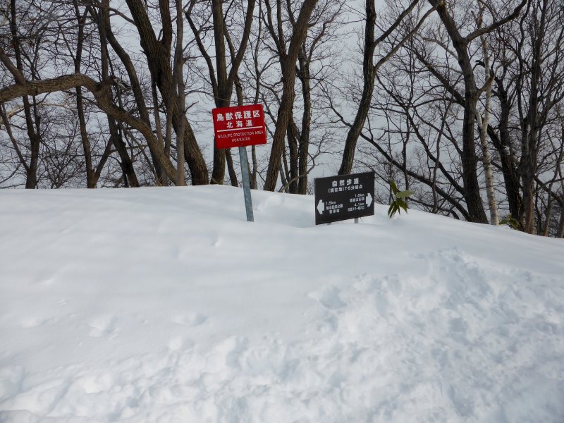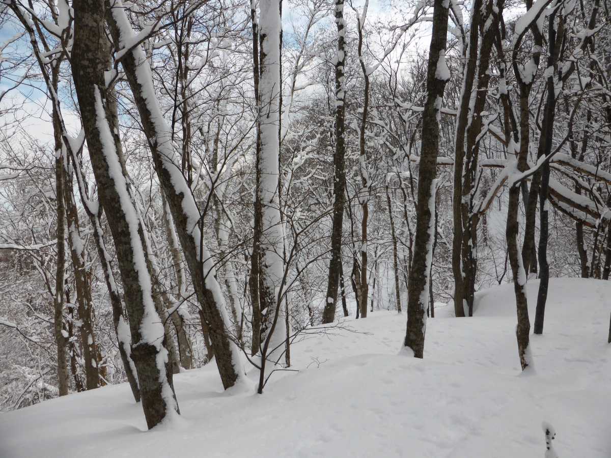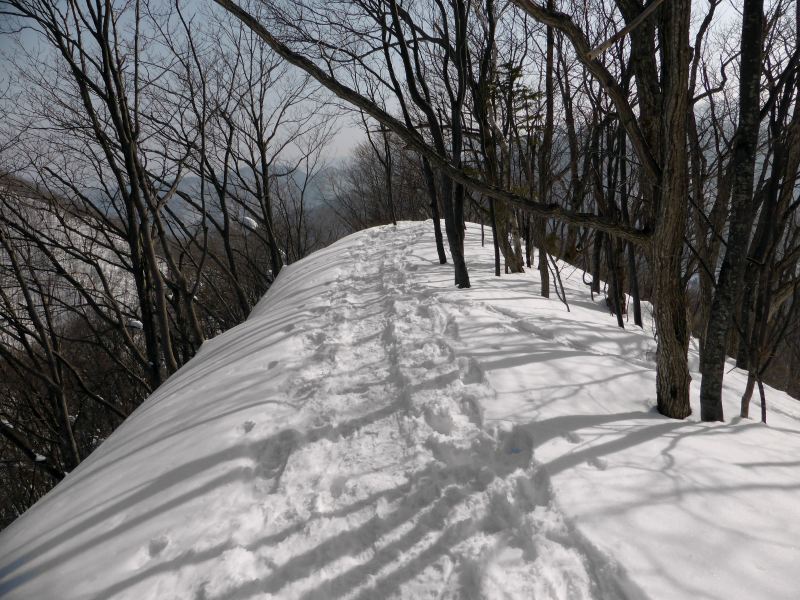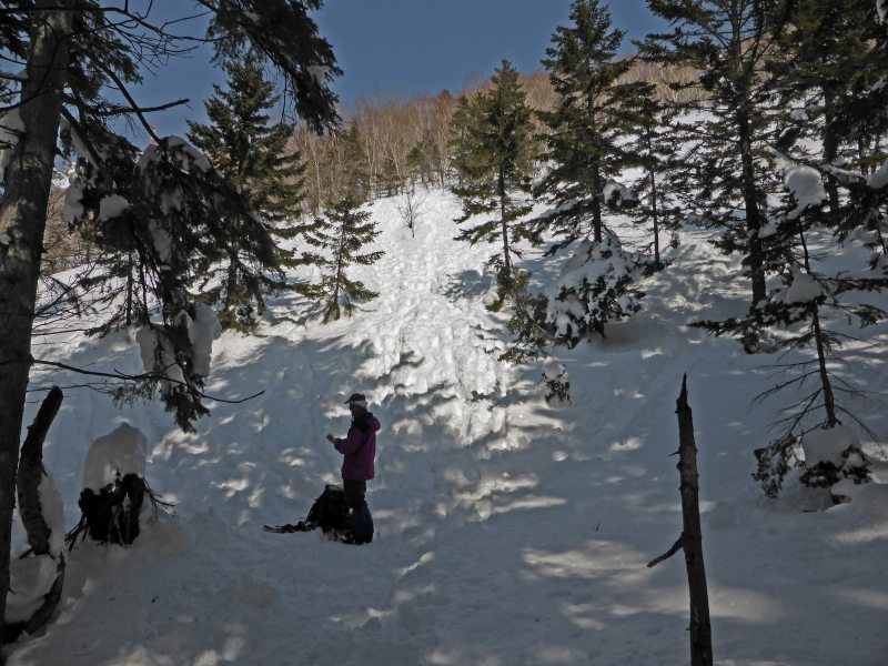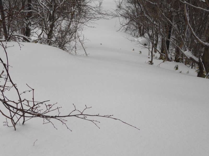 今日の登山道の状態は、暫く降雪が無かったようで、冬道の急登部分とガレ場では、スノーシューの踏み跡が広範囲に広がり、藻岩山についている様な凹型の踏み跡が全くない状態でした。