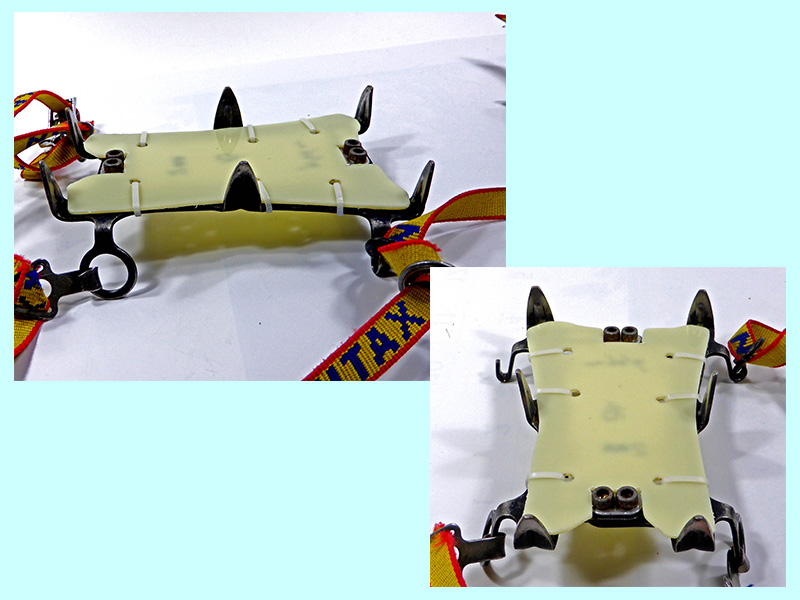 「スノープレート キット」が市販されていますが、10本爪アイゼン以上のセパレート式(前後に分かれたタイプ)用ですので、6本爪アイゼンには寸法が少し足りません。