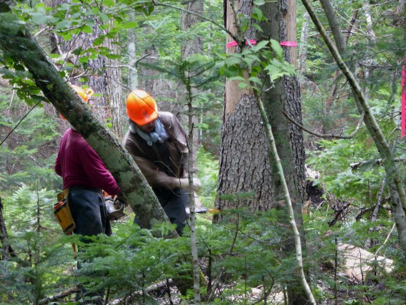 登山道脇の危険木2本を、チェーンソーで切り倒していま