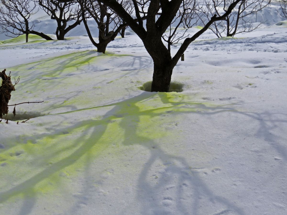 梅林では、梅の木の病気予防のため、硫黄系の薬剤が散布されています。(写真1,2)