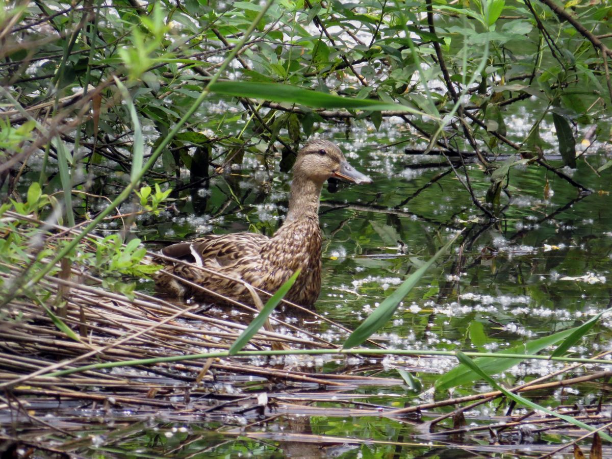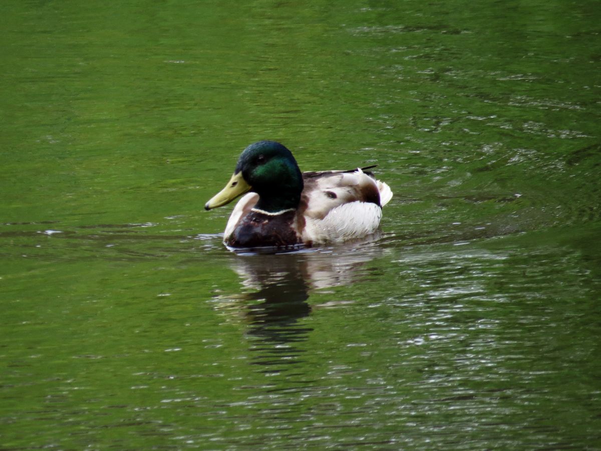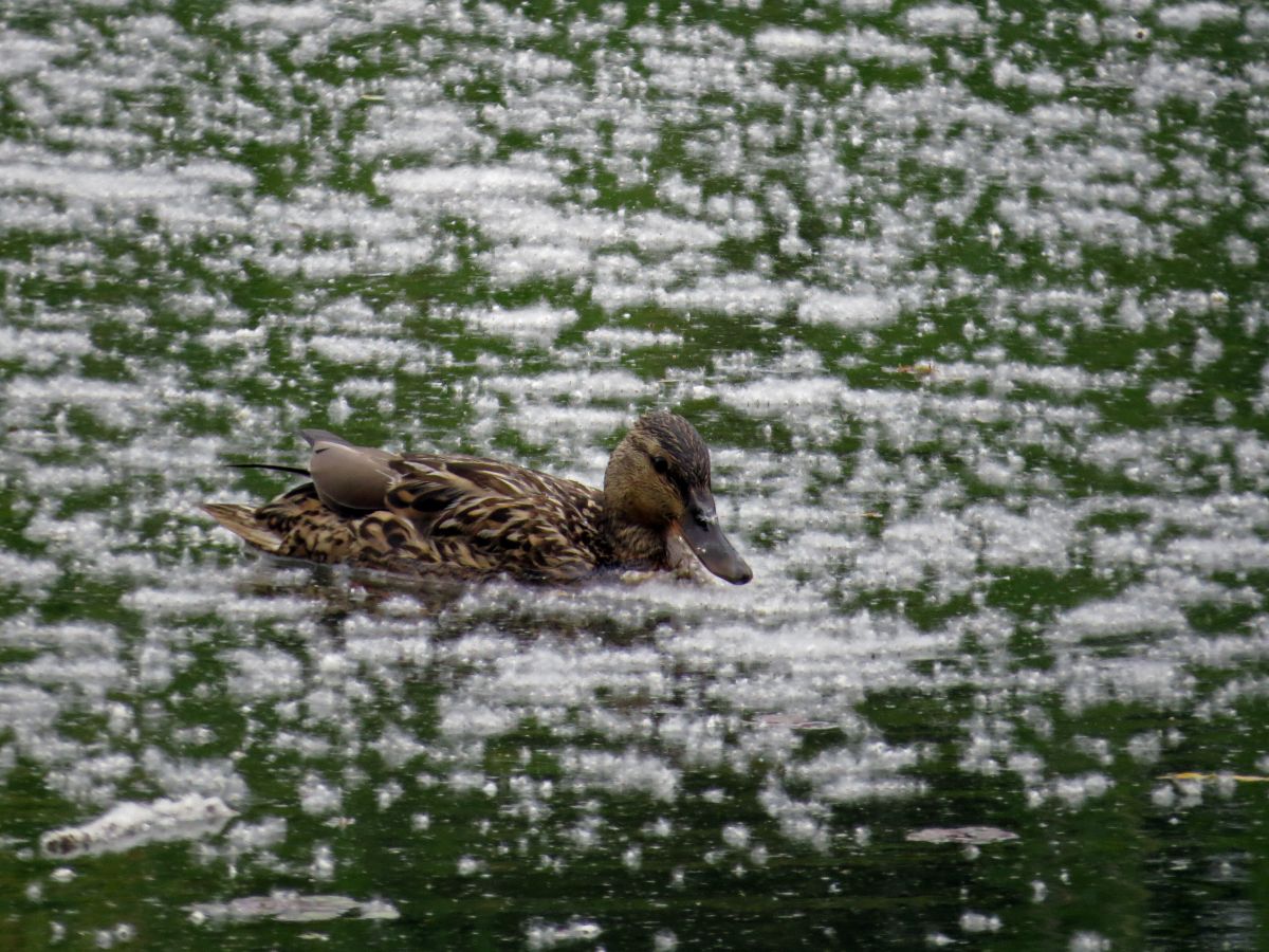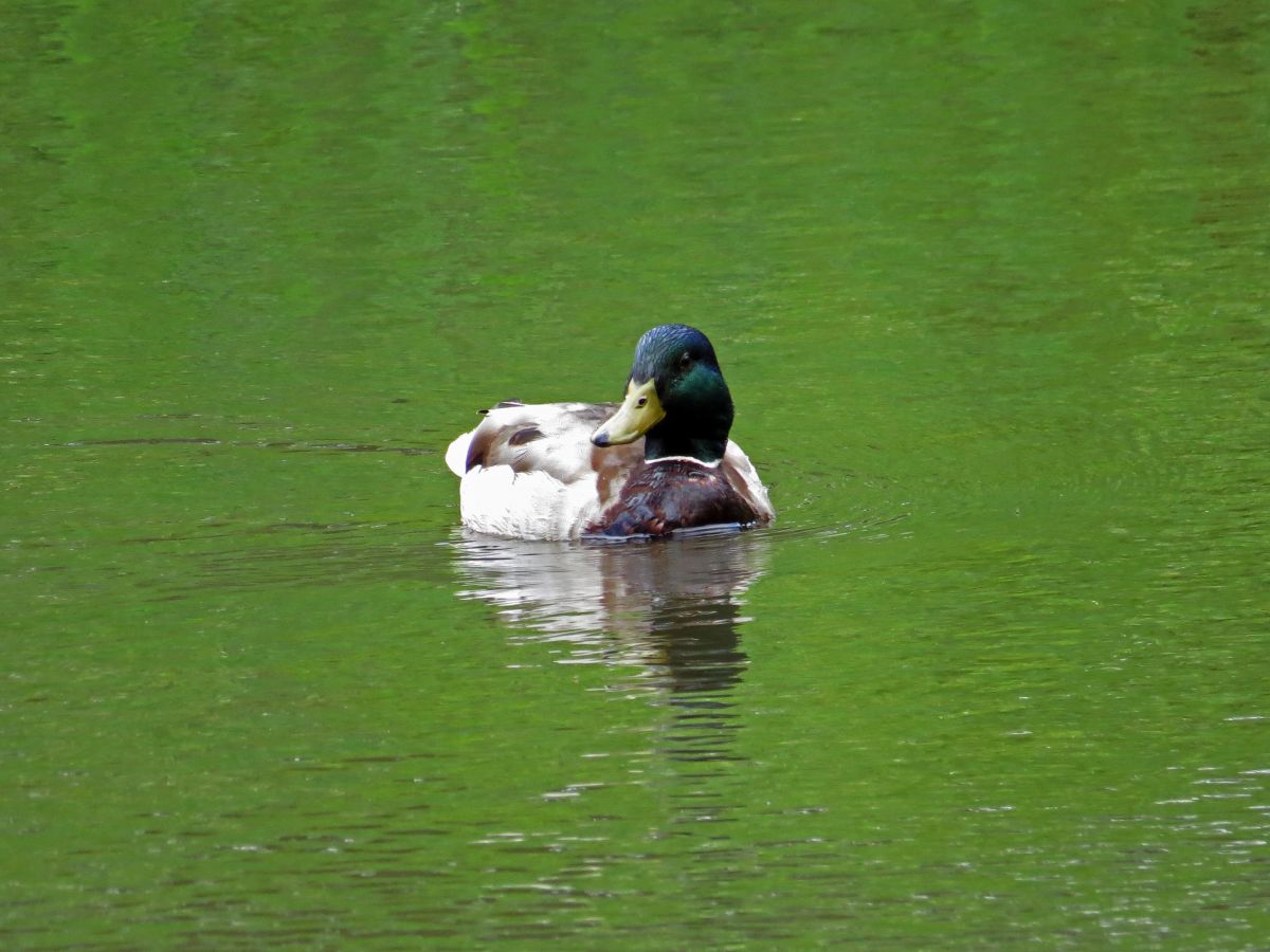 人工池では、マガモが一羽採餌をしていました。