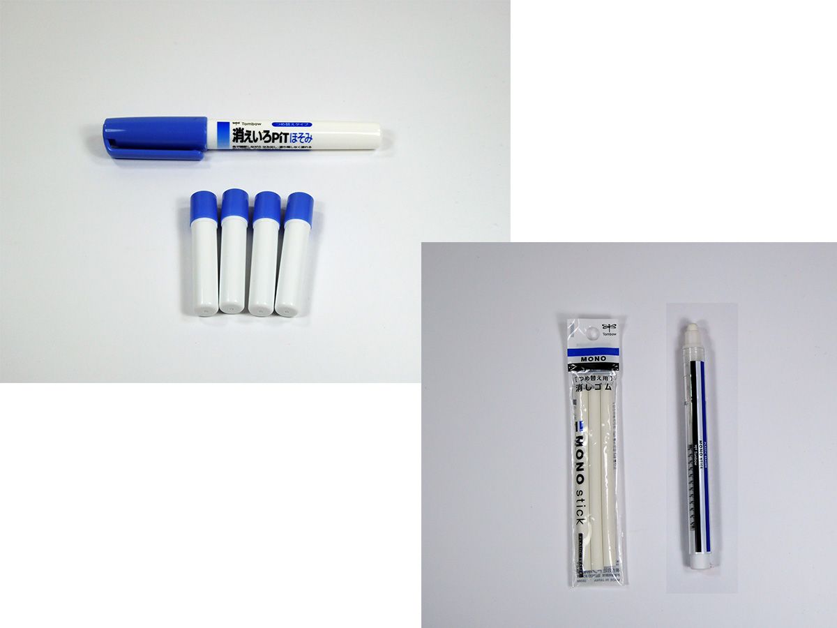 右:スティック式消しゴムと詰め替え用消しゴムです。