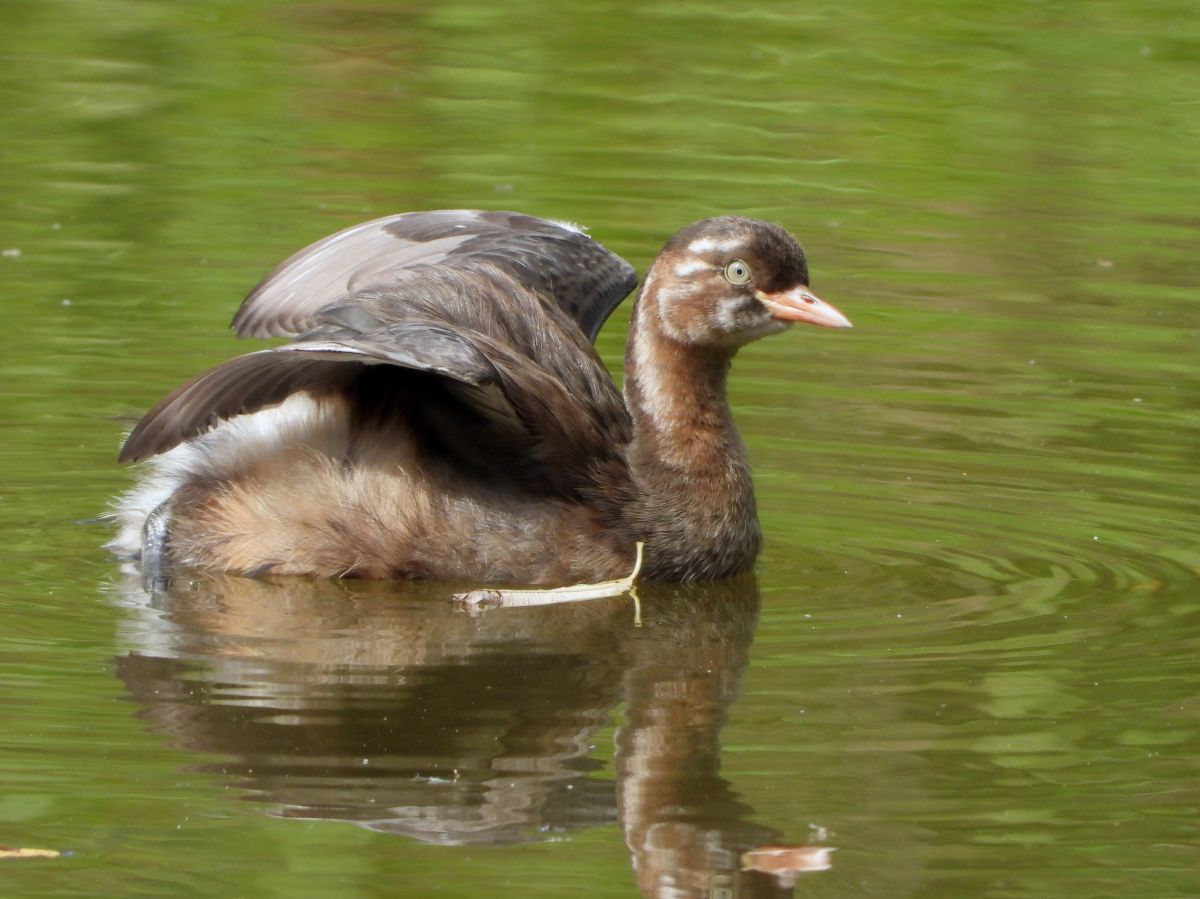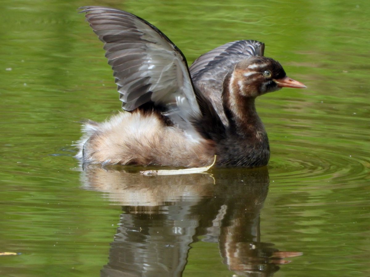 カイツブリの幼鳥は、羽根を拡げたり閉じたりしながら、羽根の手入れをしていました。(写真5,6)