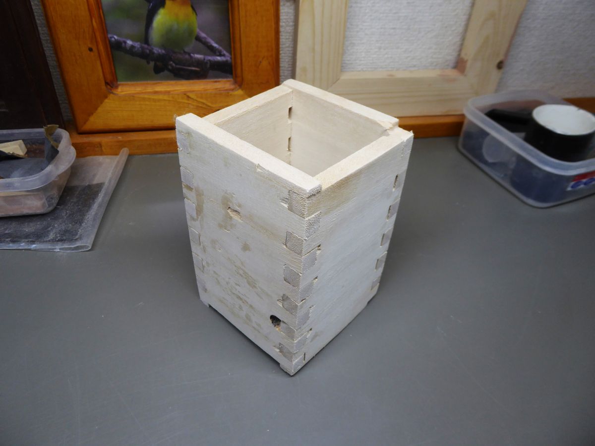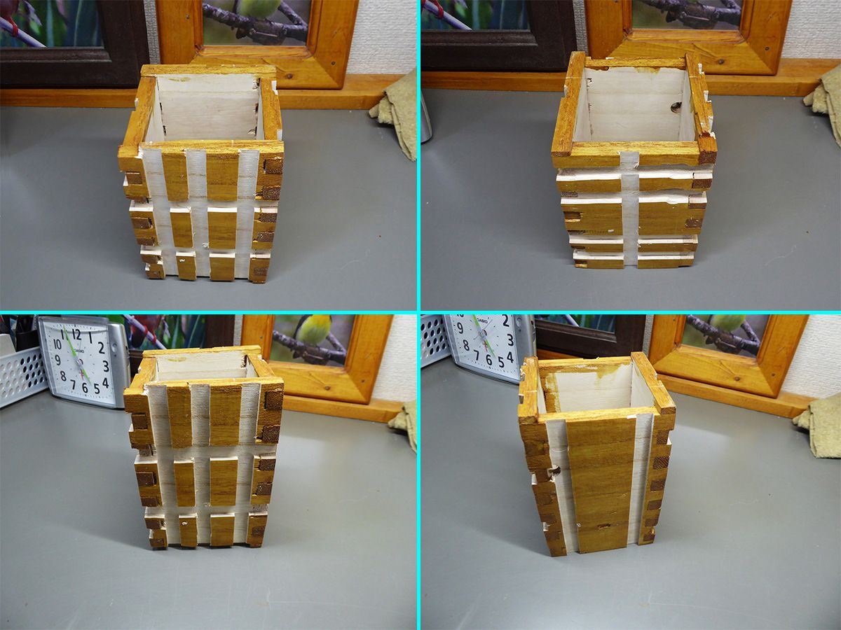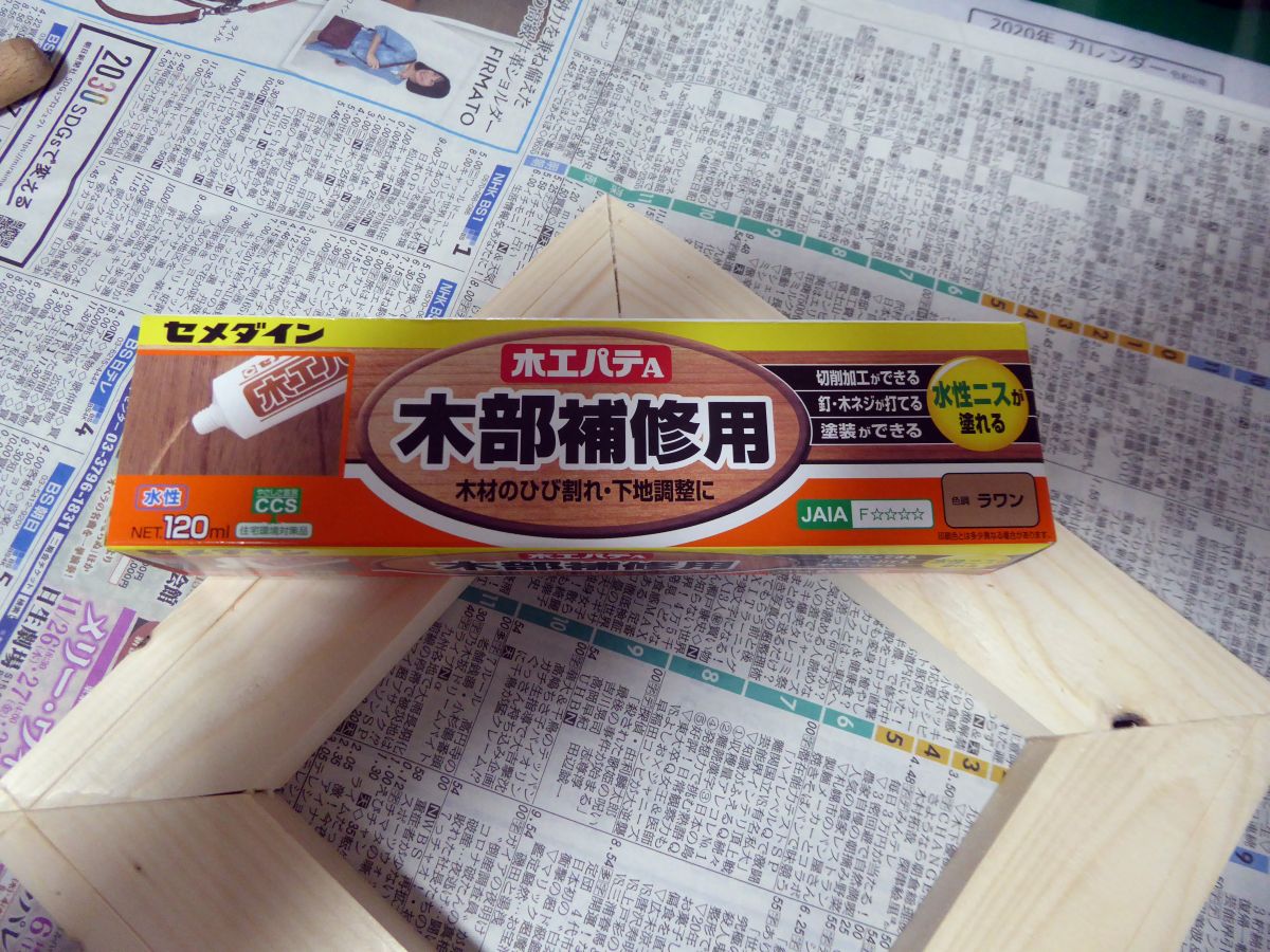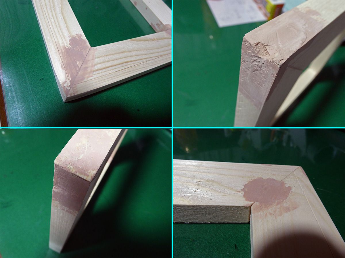 木工用ボンドを塗って組み立てたあとで、木工用パテで補修をしてみました。(写真6)