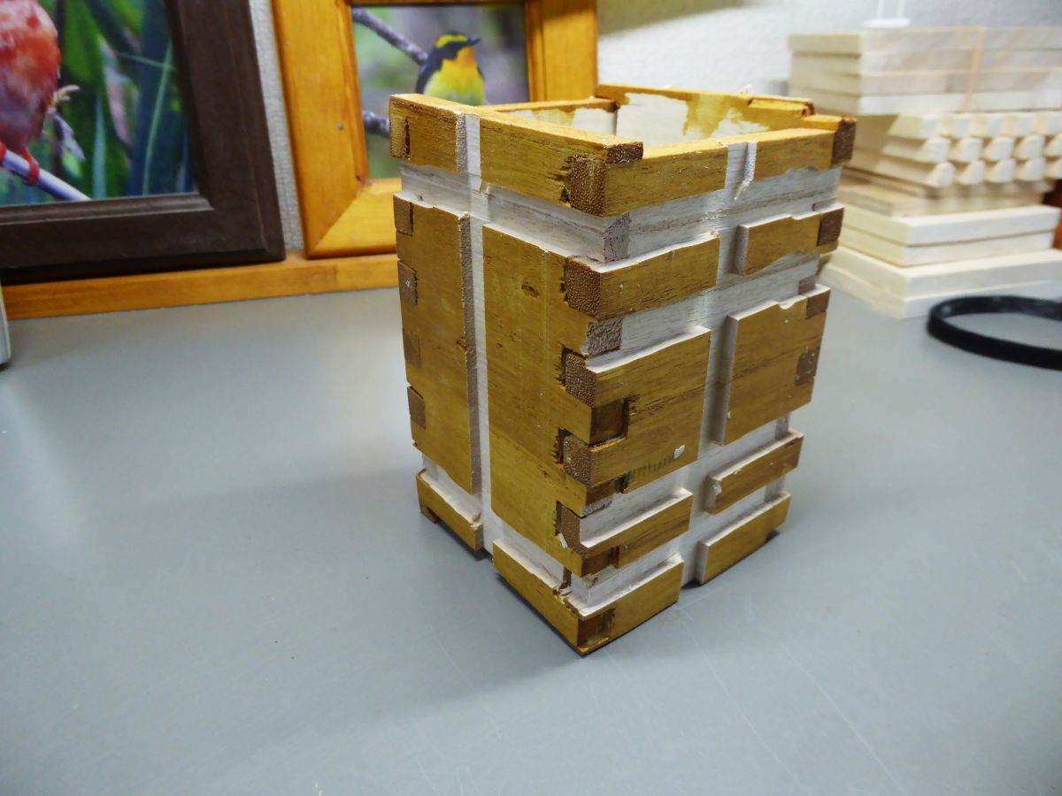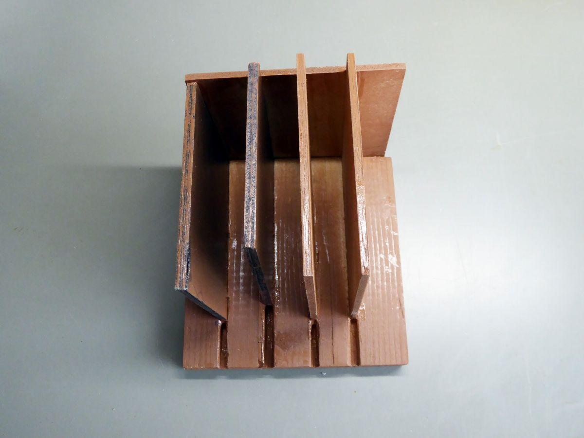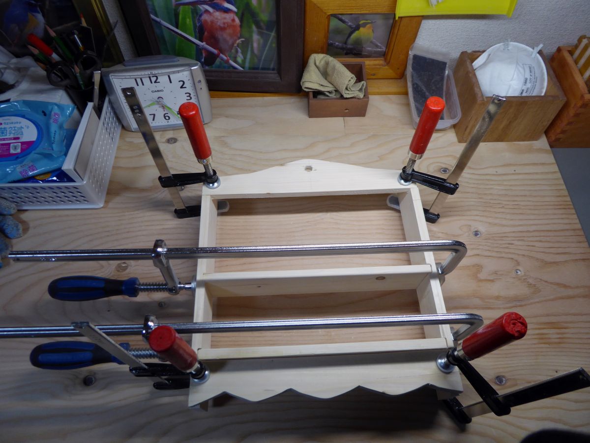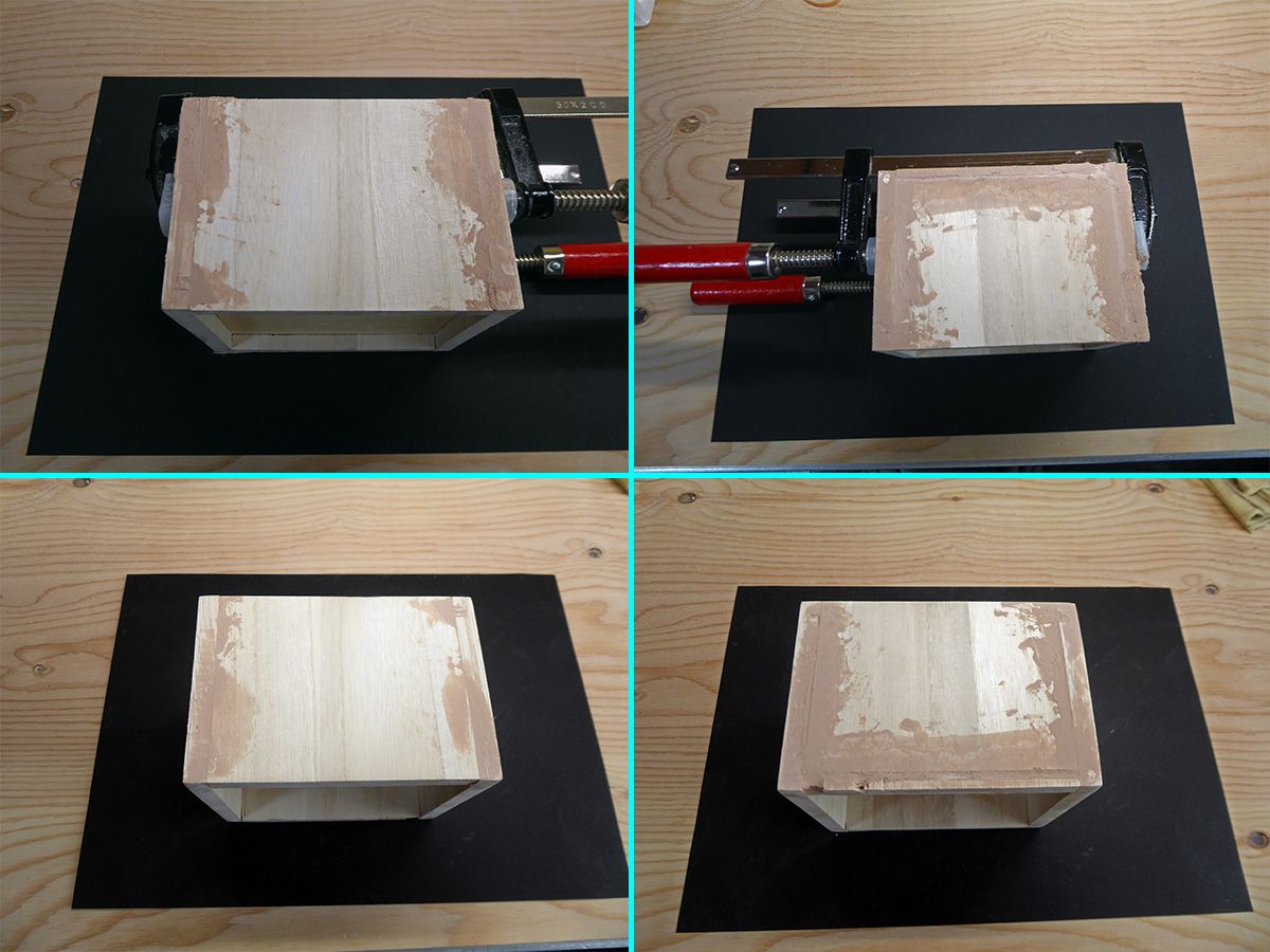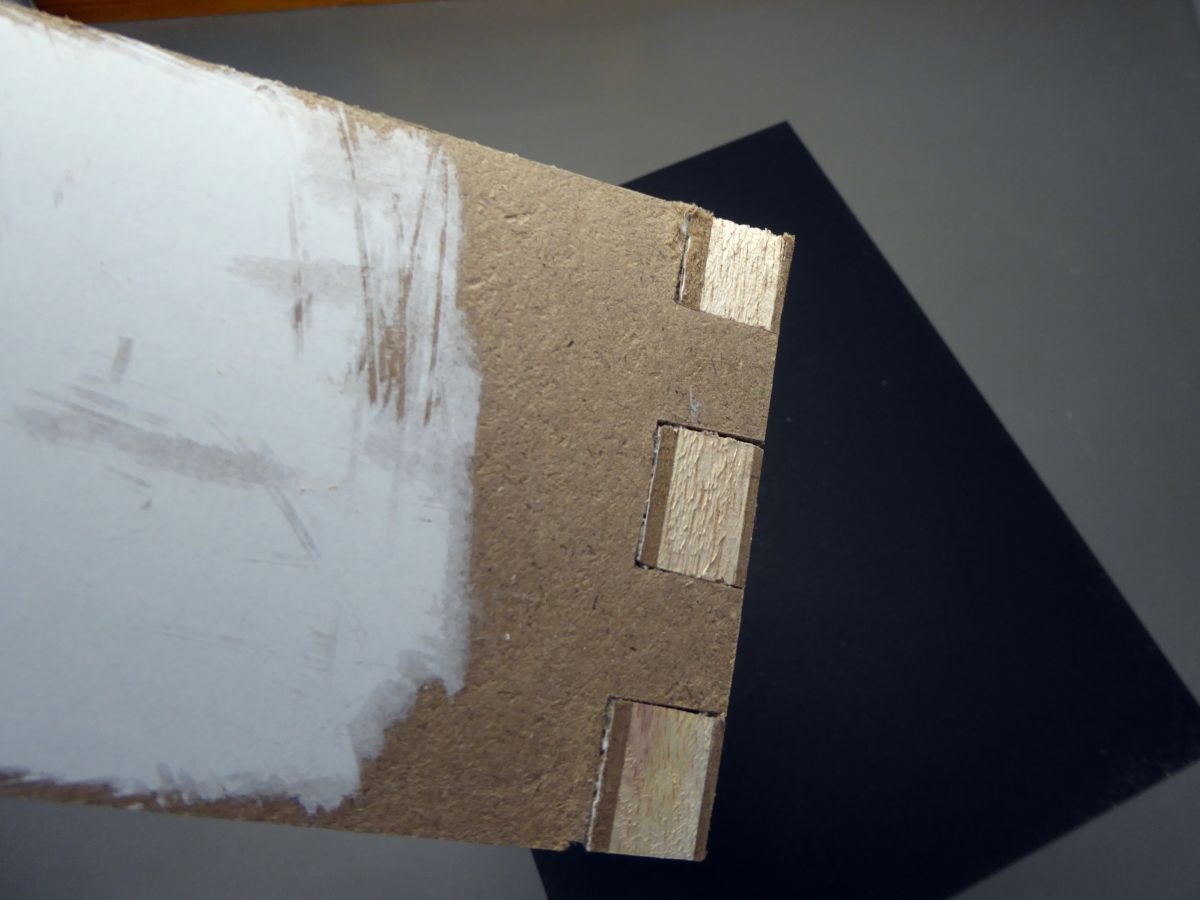 木工用ボンドを塗って組み立てたあとで、木工用パテで補修をしてみました。(写真6)