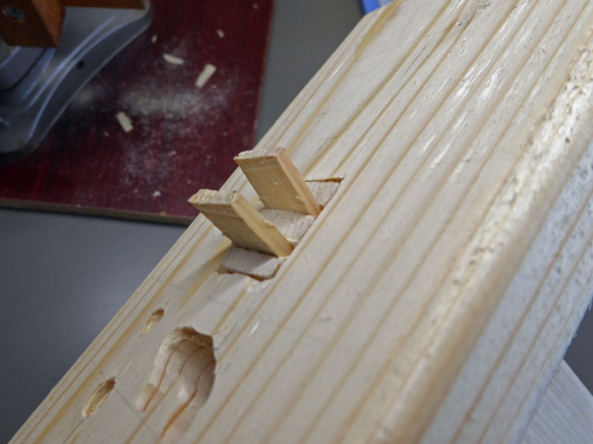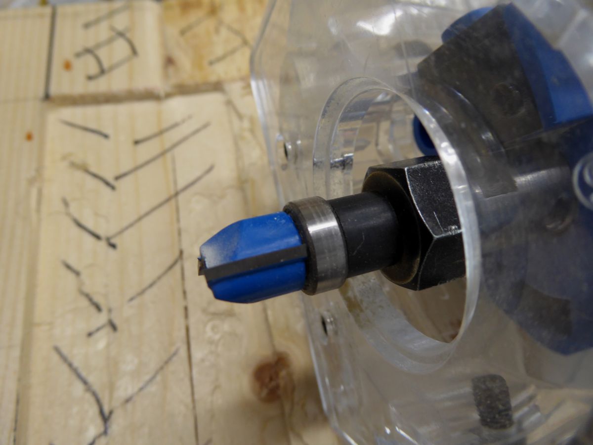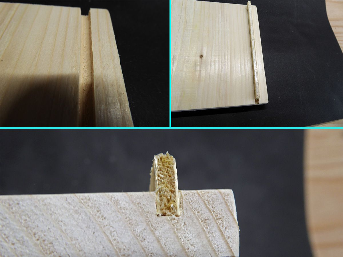 木材があまりにも軟らかいので、トリマーで溝を彫る作業で、木材の欠けが発生しています。