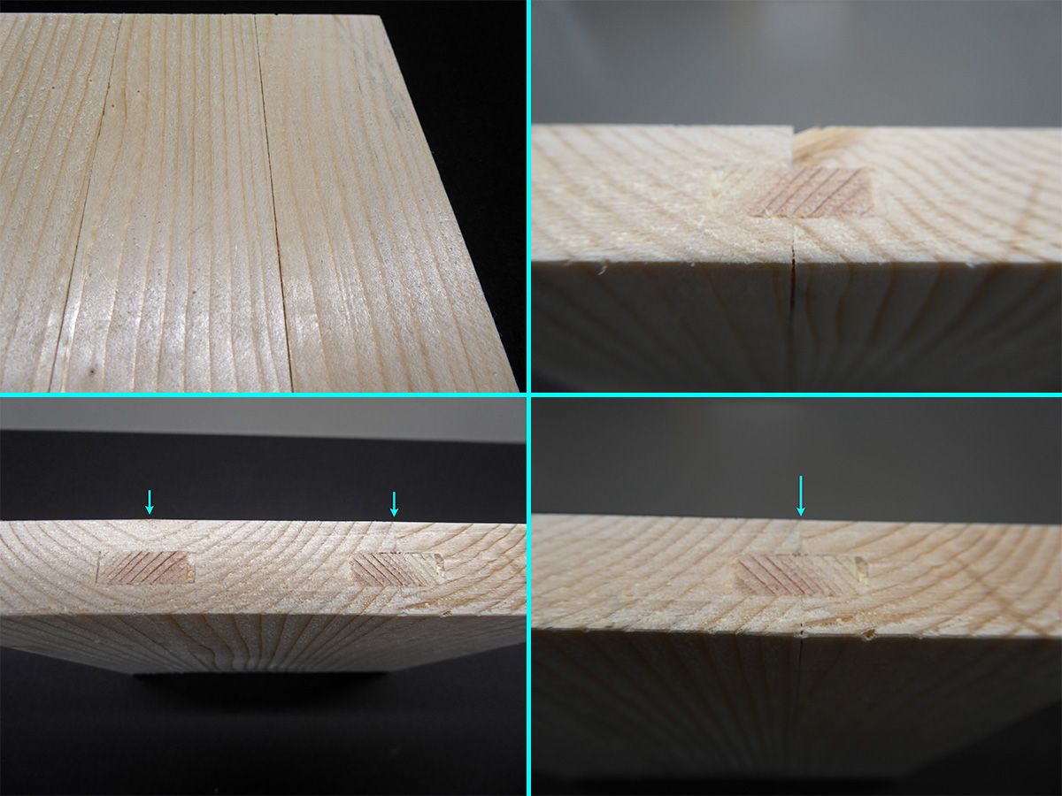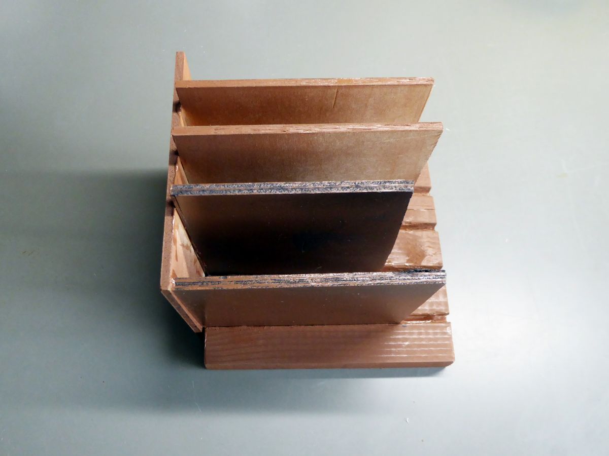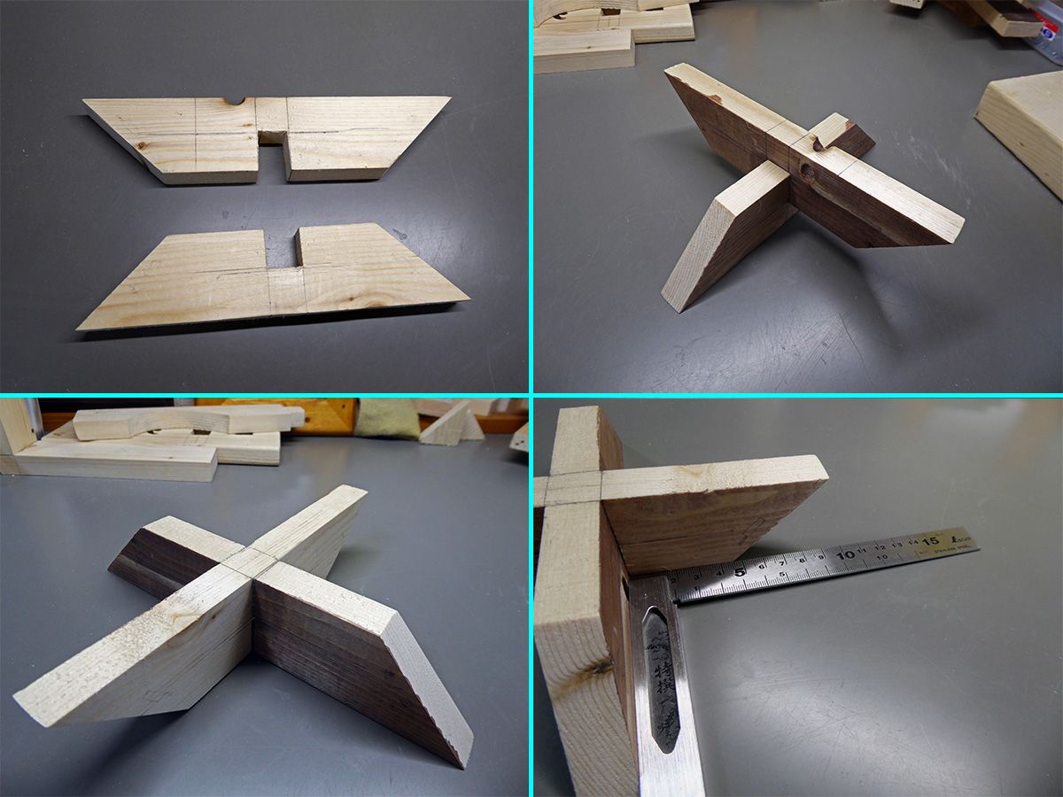 違いは、材料の正確な切断、木材の平滑化の度合い、側板に棚板を取り付ける場所の「大入れ組み手」の正確性などで、まだまだ練習をしないといけませんね。