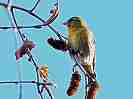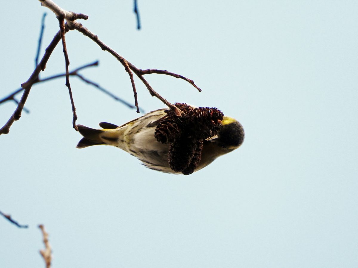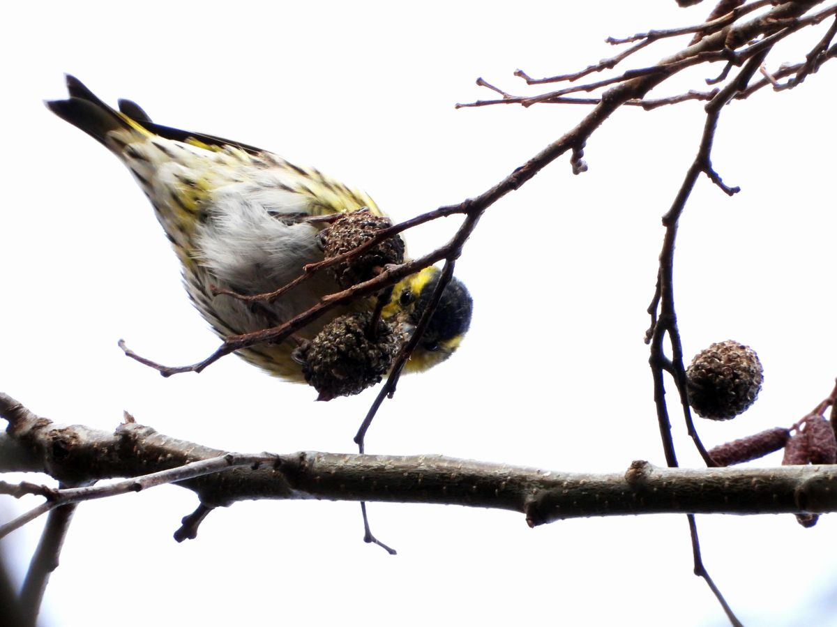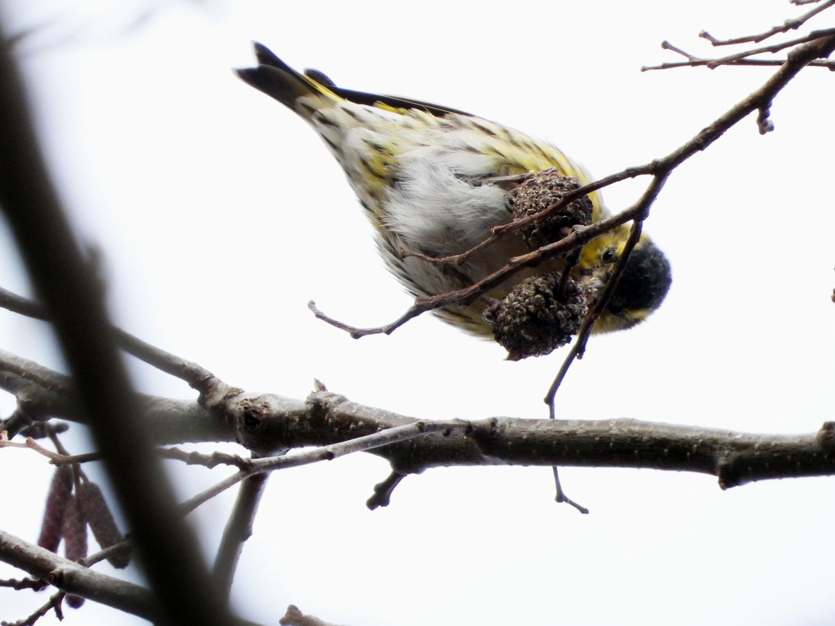 マヒワは、高木の梢部分で採餌をするため、殆ど下には降りてきません。