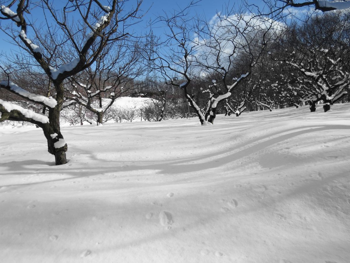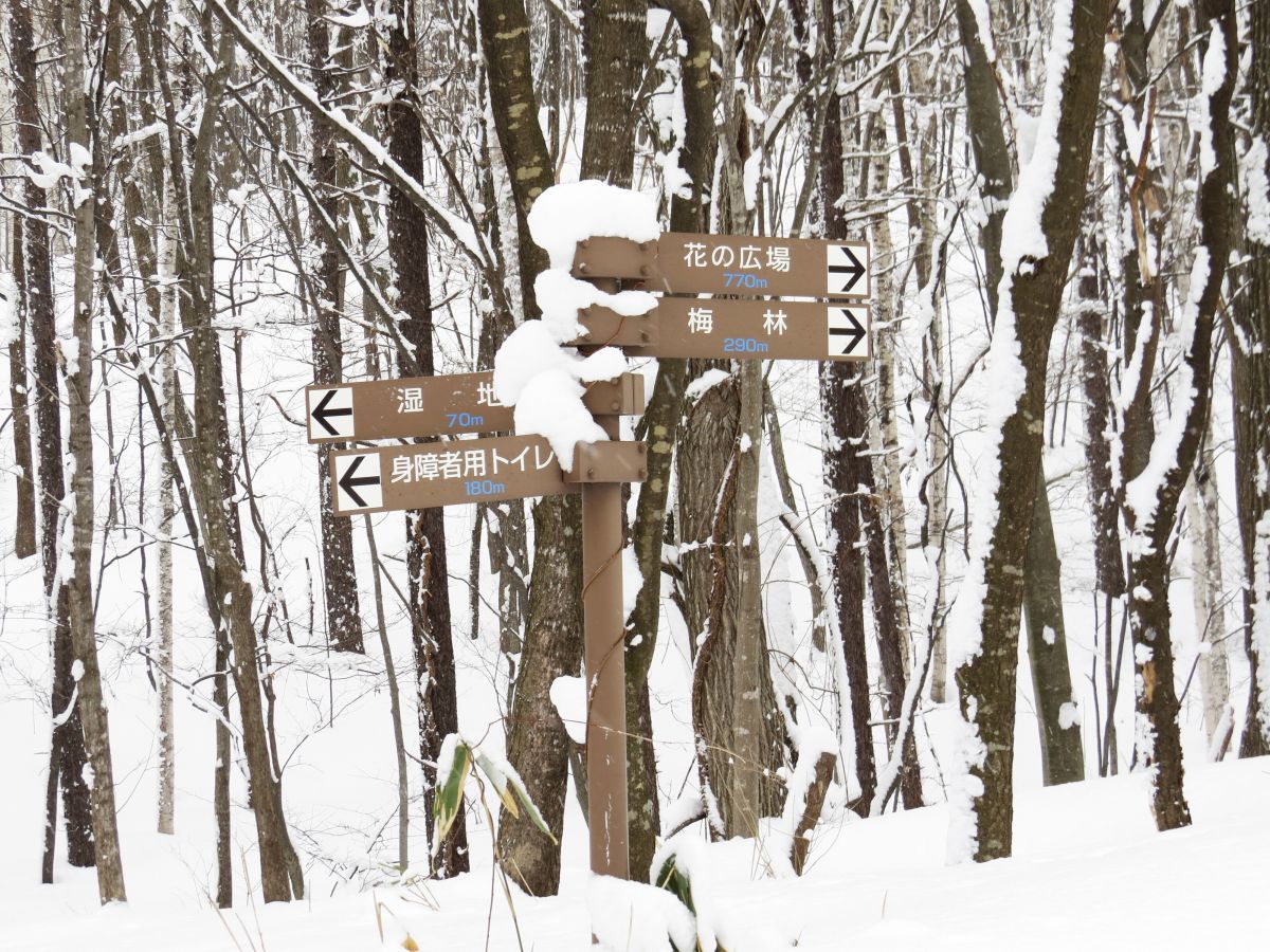 最近は時々気温が上がって木道上の雪を減らしていましたが、梅林では今冬の最深積雪になったと思われます。(写真1)