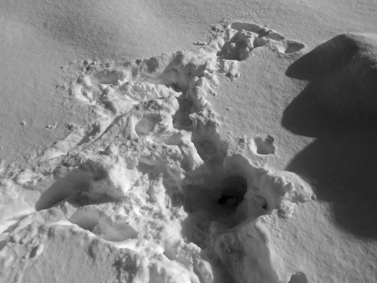 以前に出来た遊歩道の踏み抜き跡は、その後の気温低下で固くなっています。