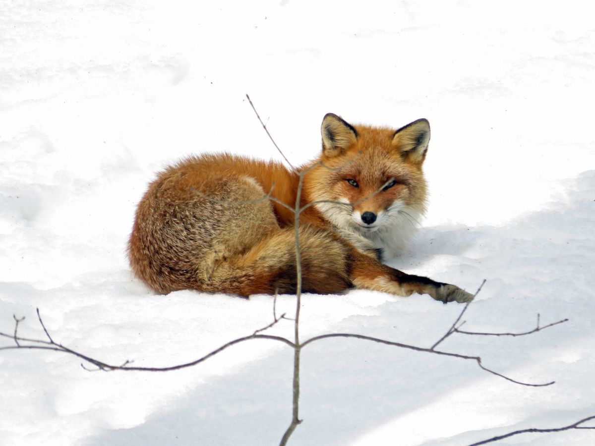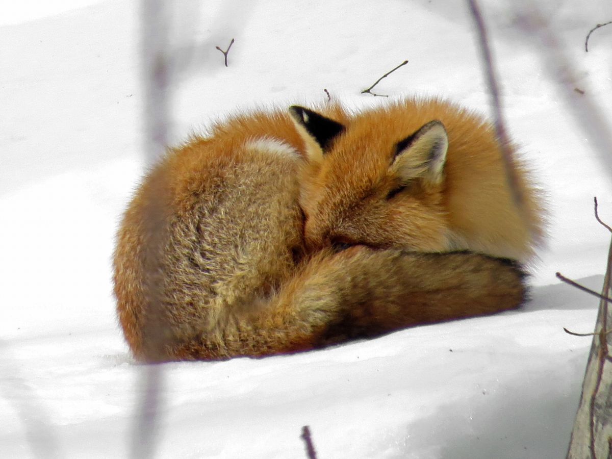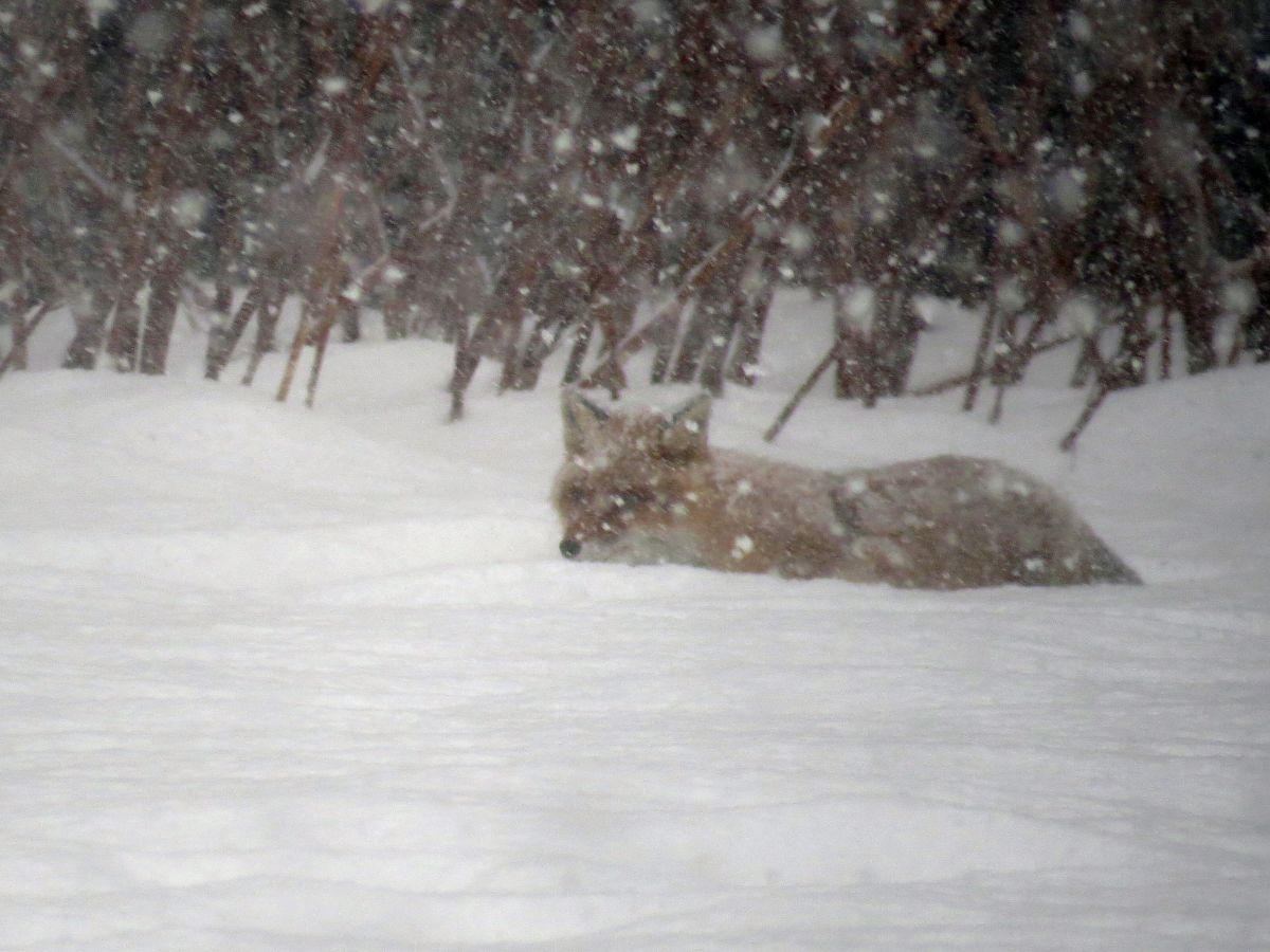 この雪の中で、キタキツネ一匹が斜面で休憩をしていました。(写真1〜2)