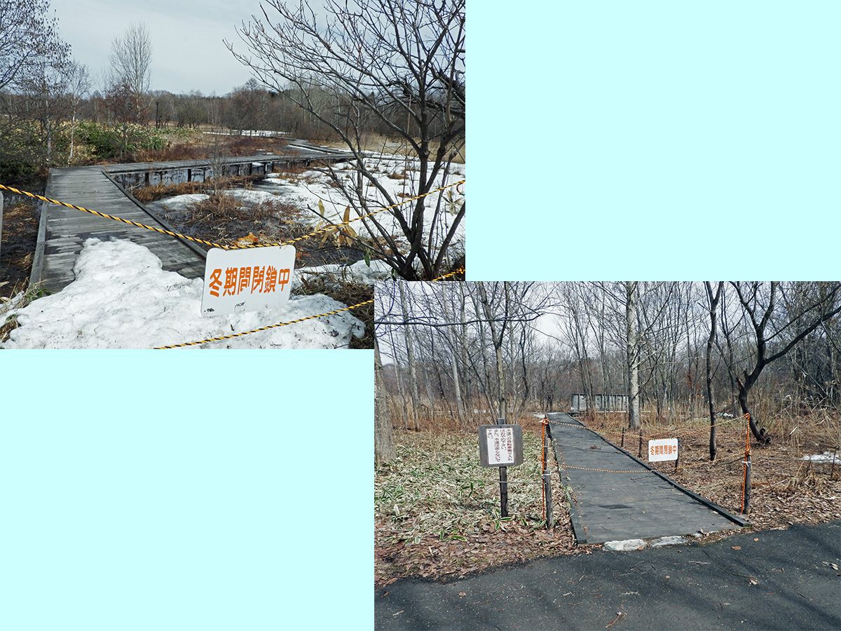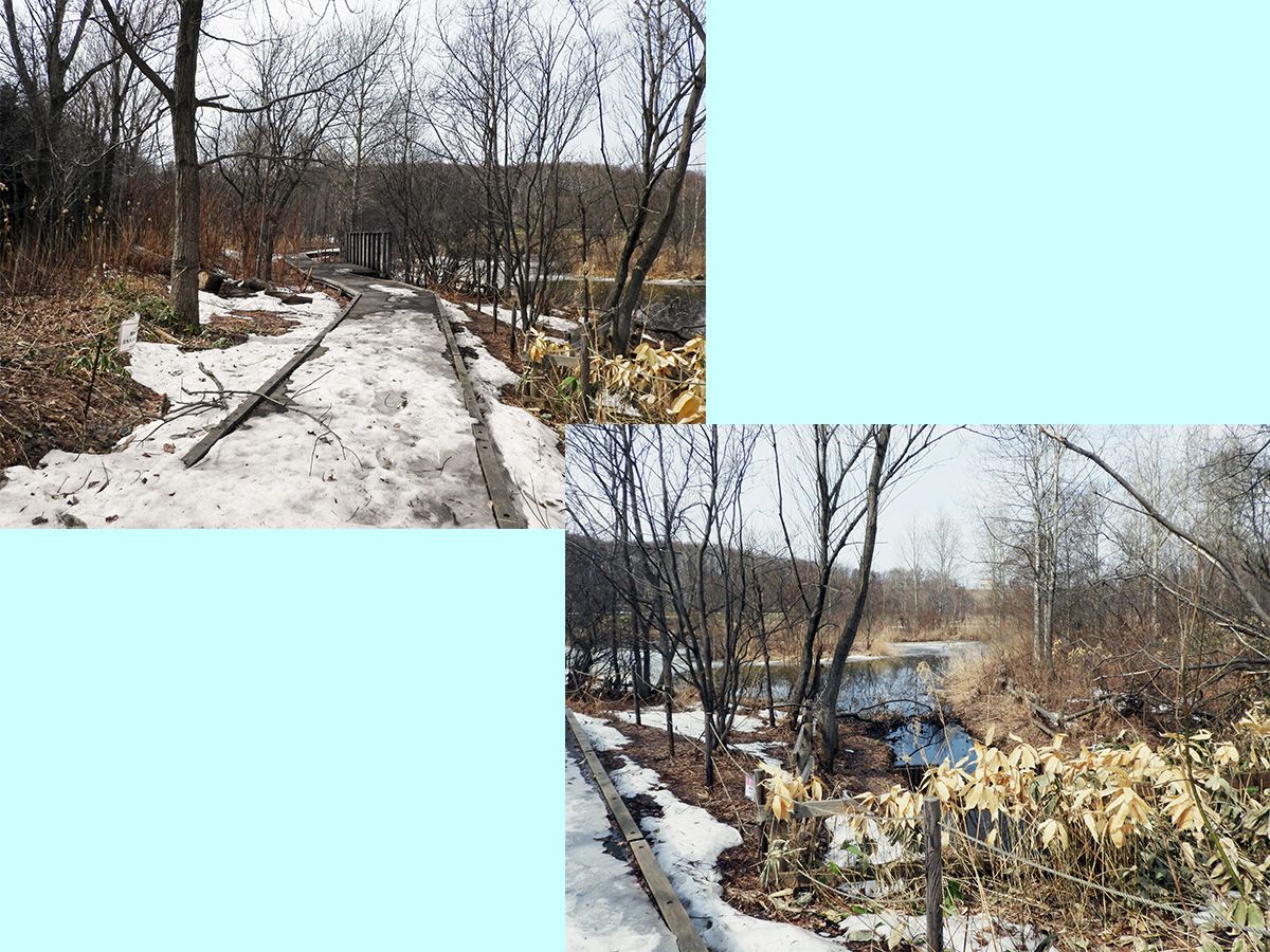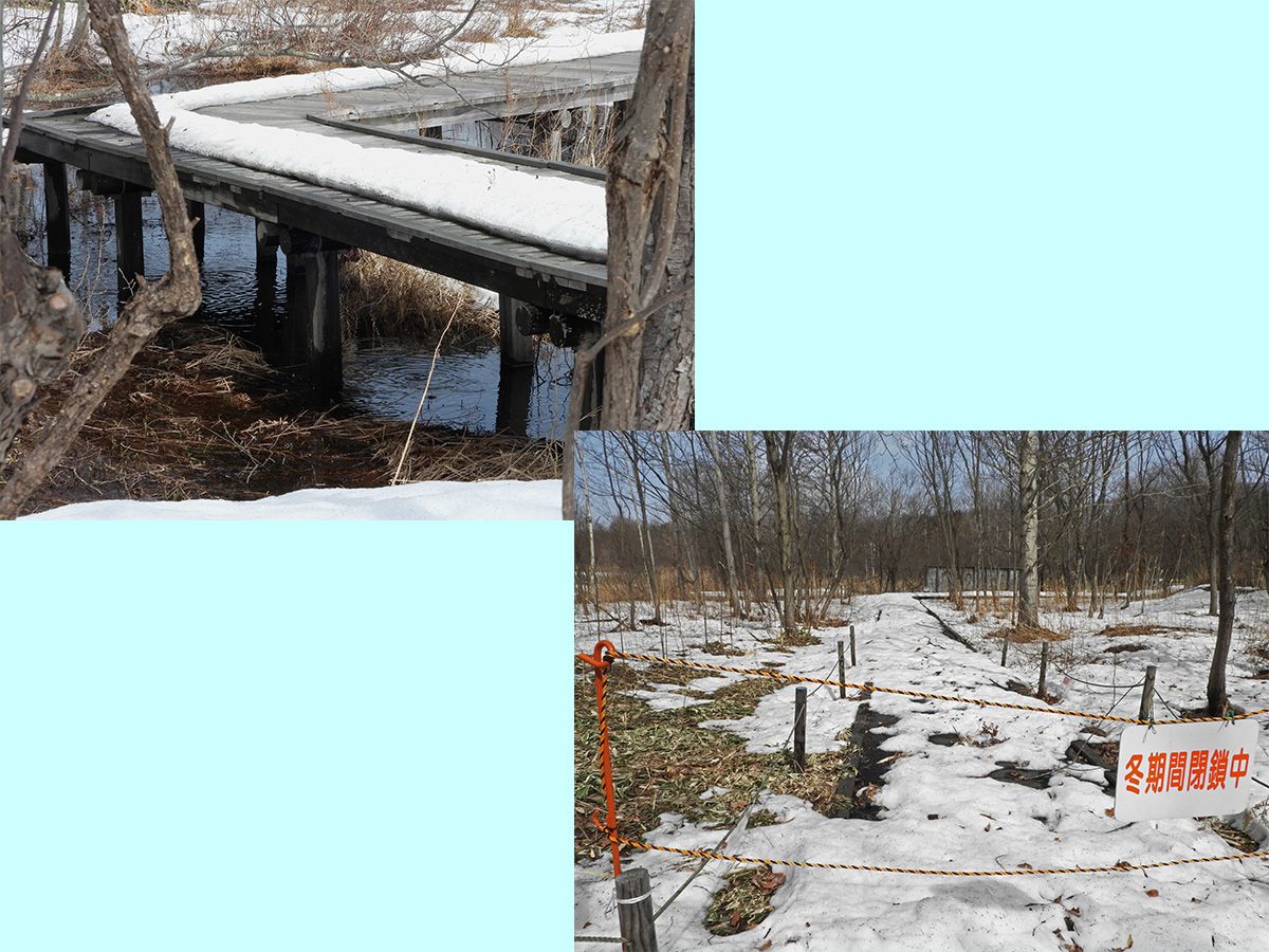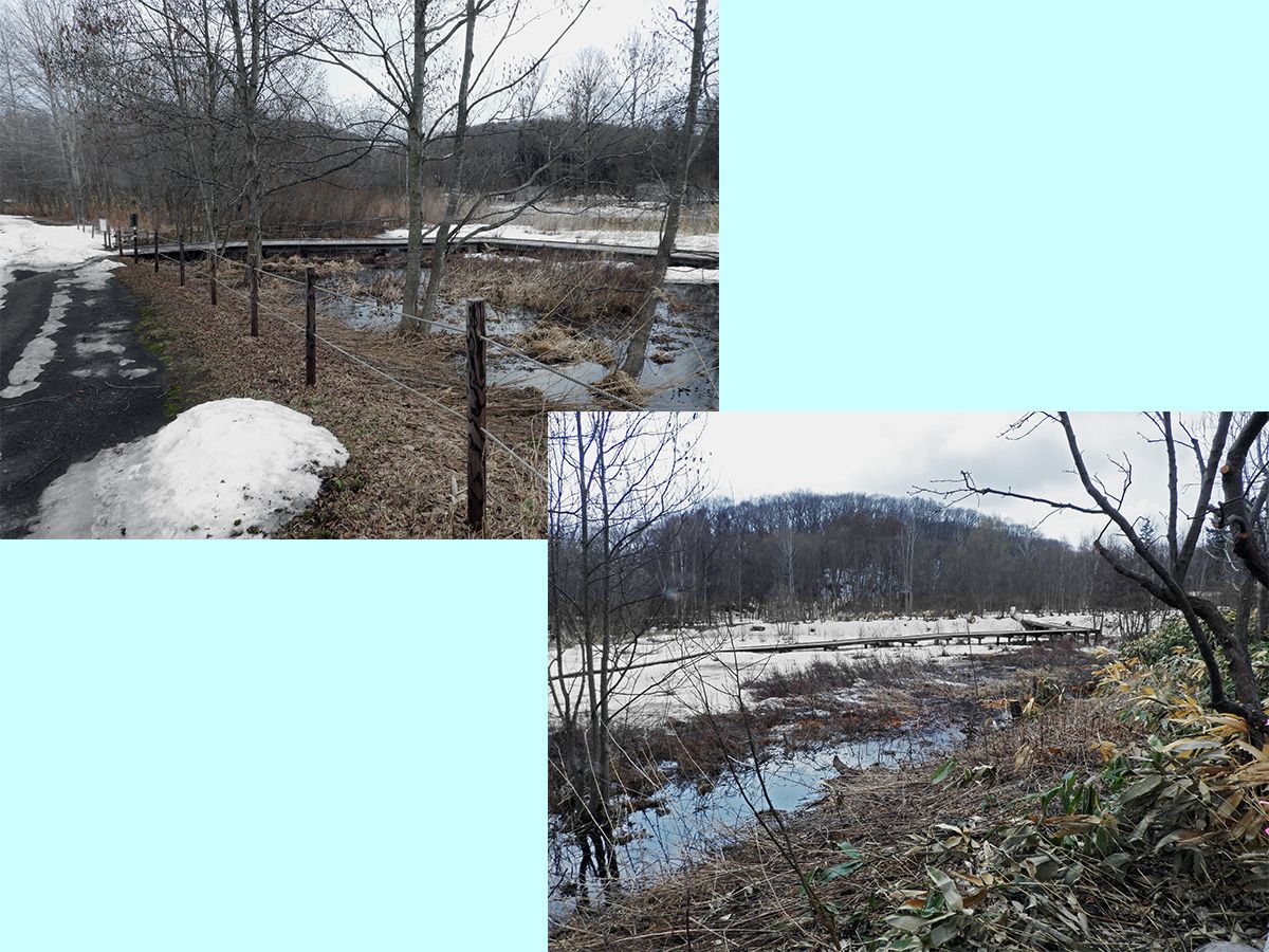 人工池と隣接した湿原の木道は、ほぼ雪解けが完了しました。(写真2)