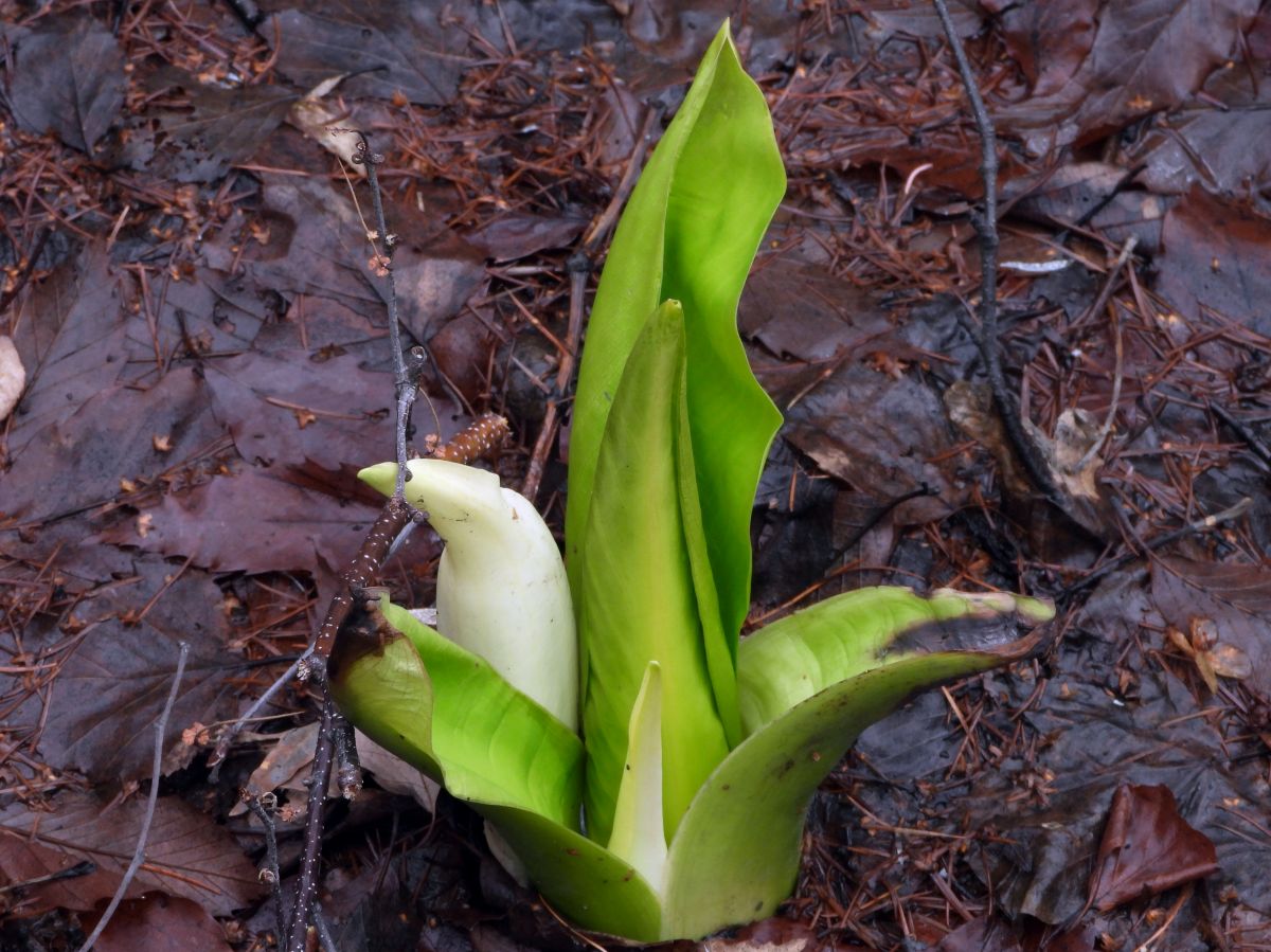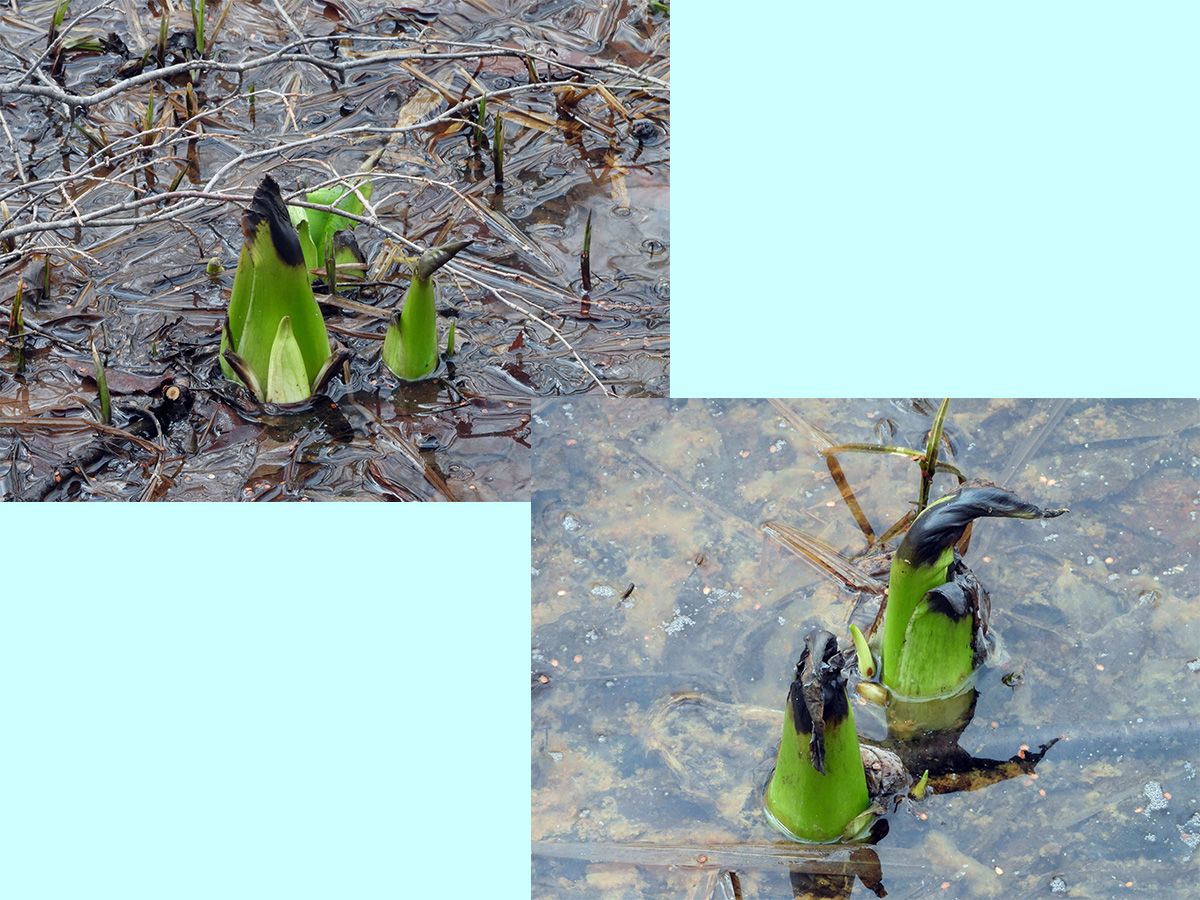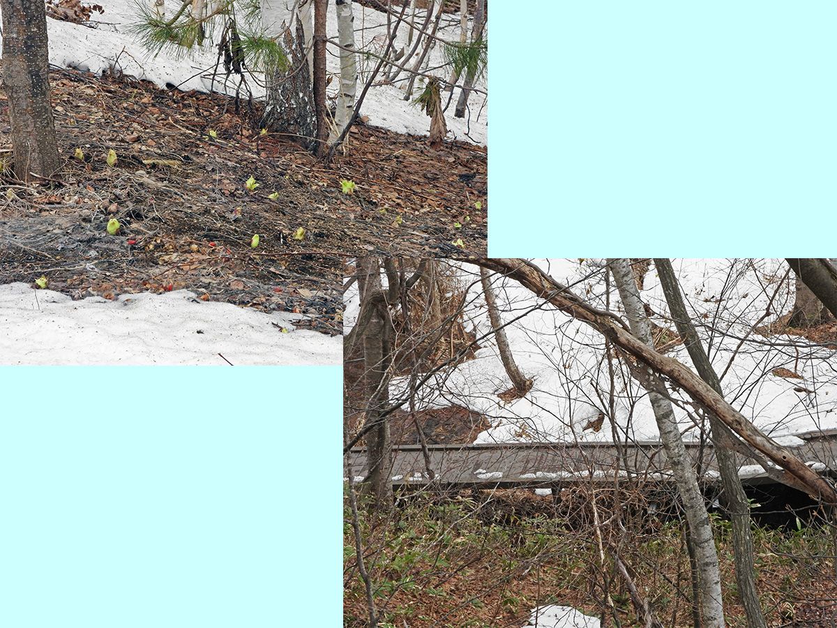 湿原の雪の消えた場所では、一斉に水芭蕉が育ち始めています。(写真7)