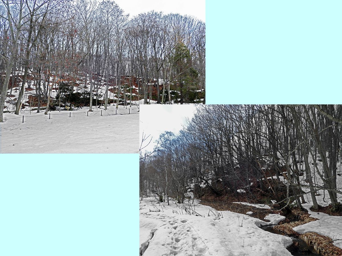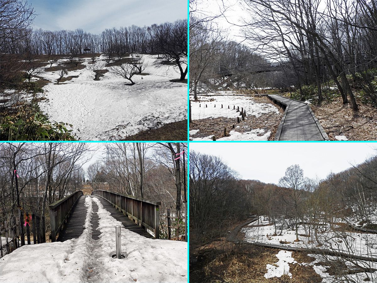 第一駐車場下の湿原では、木道上の雪がほぼ消えてしまい、雪の上を歩くことはなくなりました。(写真1:上段)