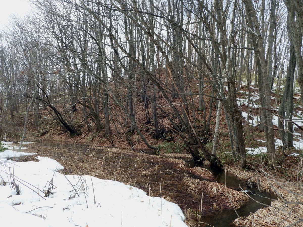 第一駐車場下の湿原のエゾノリュウキンカが咲く場所は、まだ少し雪が被った状態です。