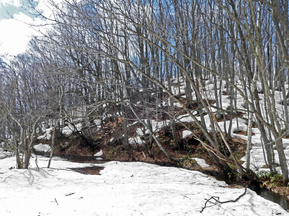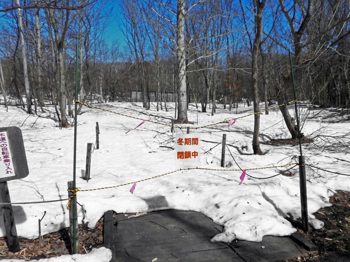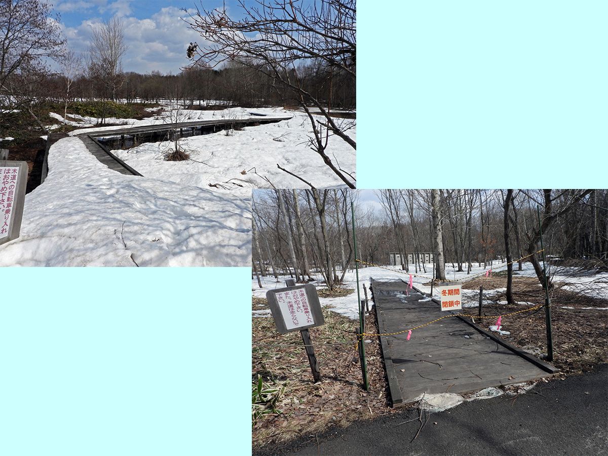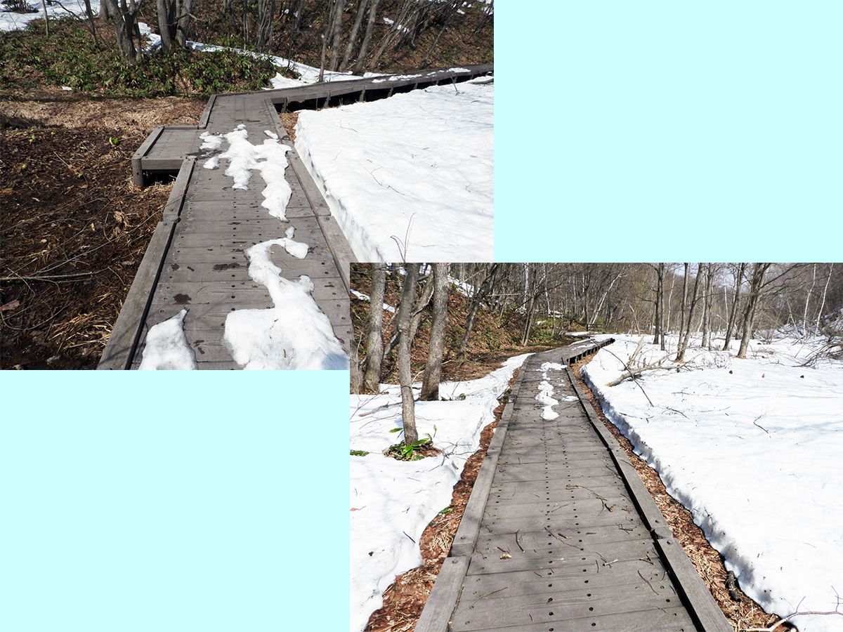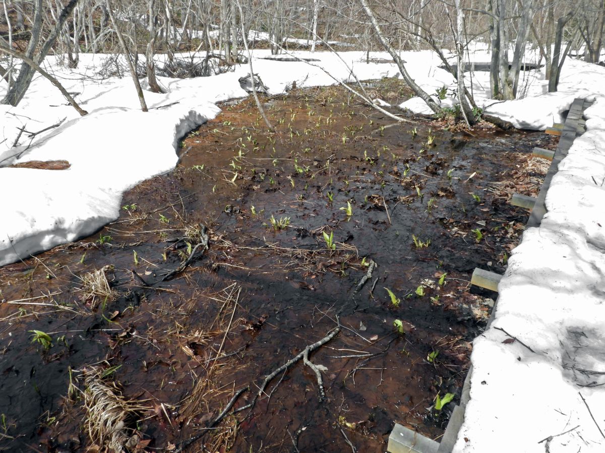 ただし、林のなかの木々は、梢部分が薄らと緑色になってきた程度で、湿原の木々とは葉の生長が大幅に遅れています。