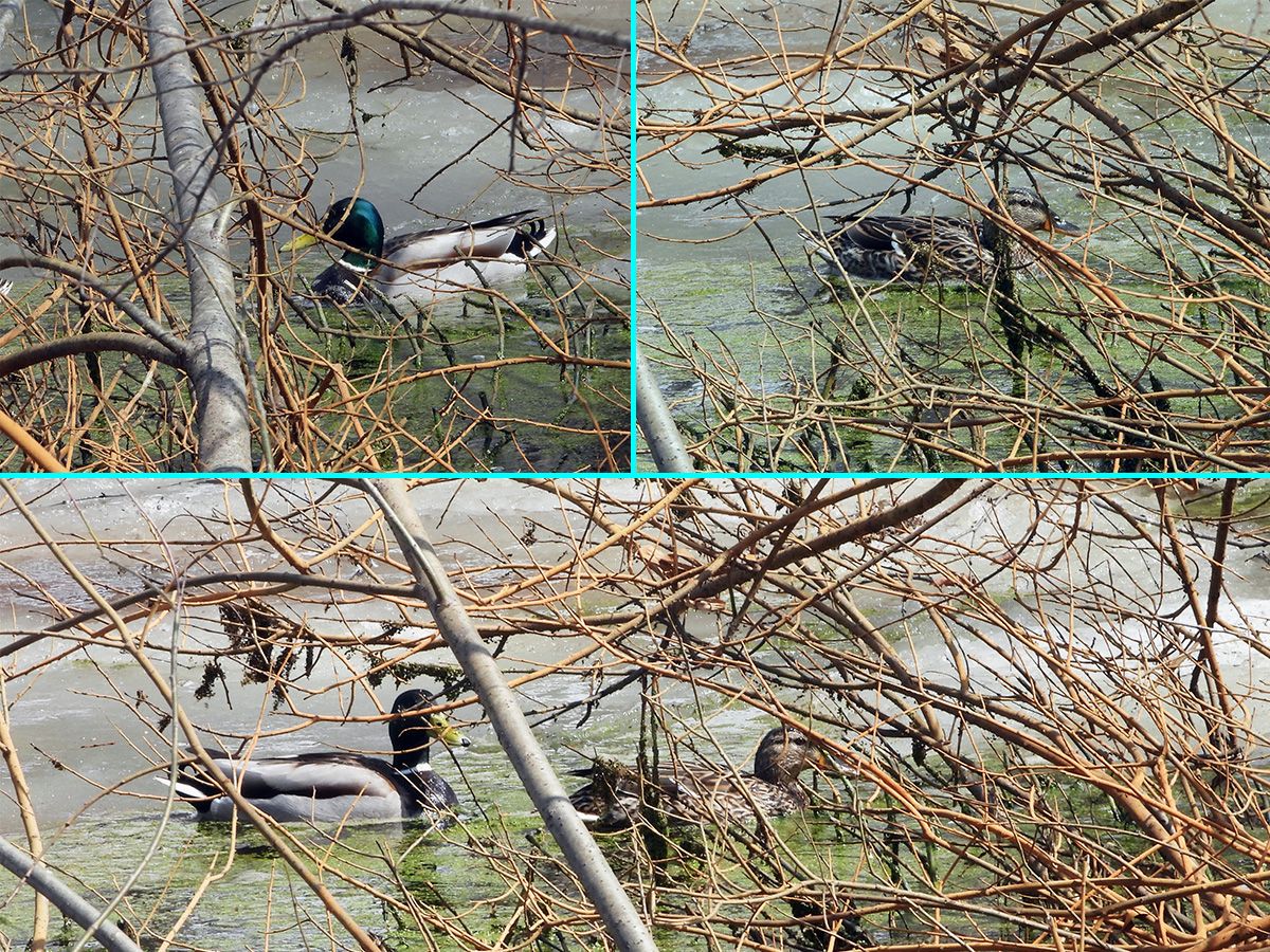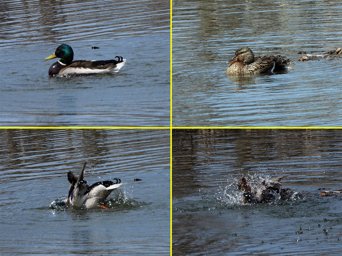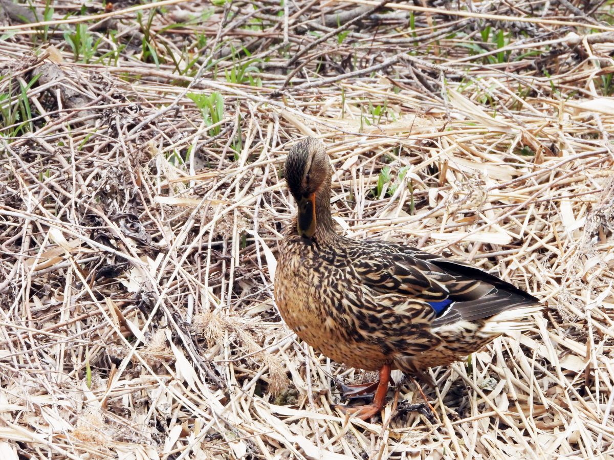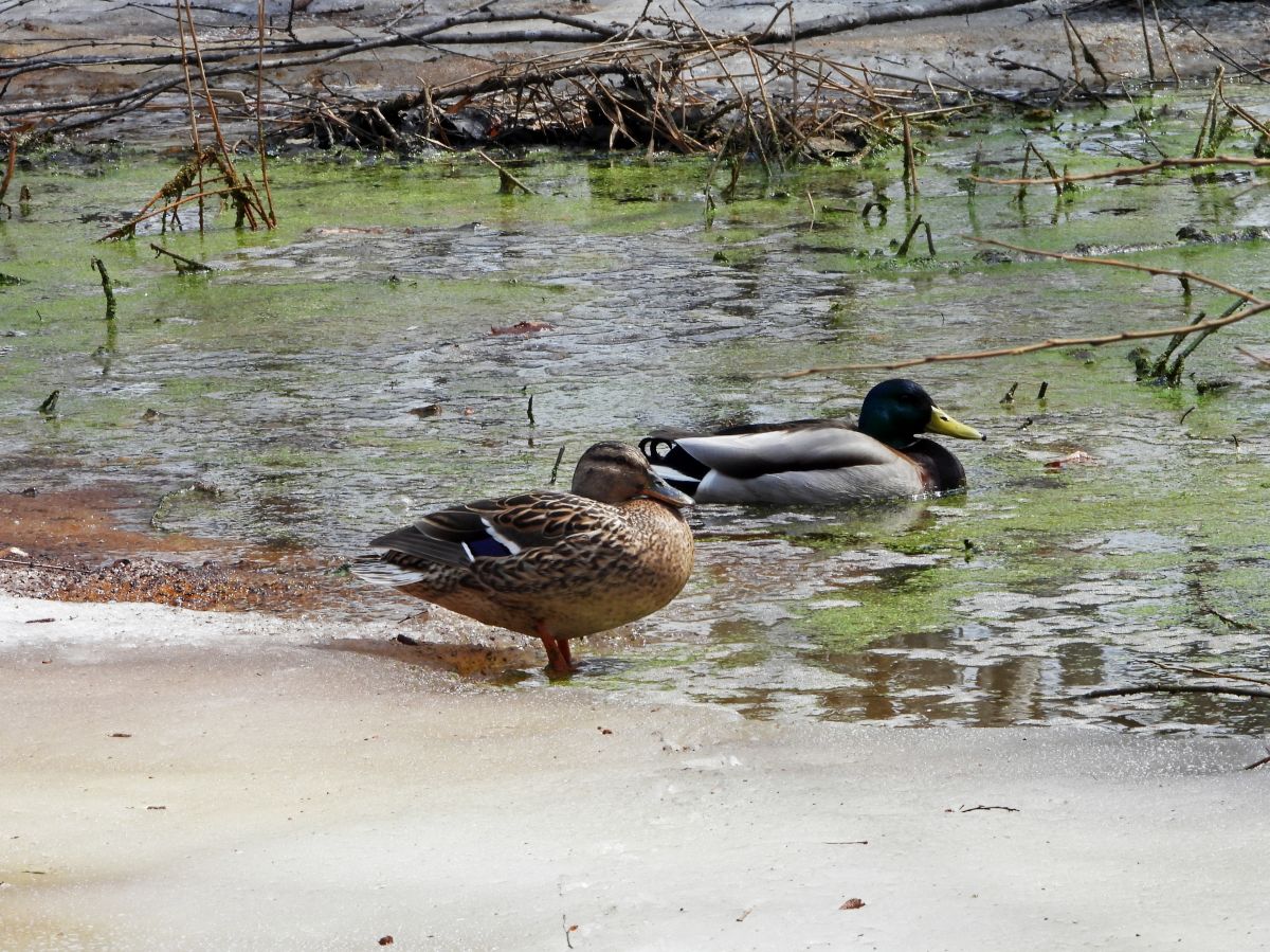 毎年人工池で子育てをしているマガモに注目していますが、今日はつがいで中島に上がっていました。(写真6〜8)