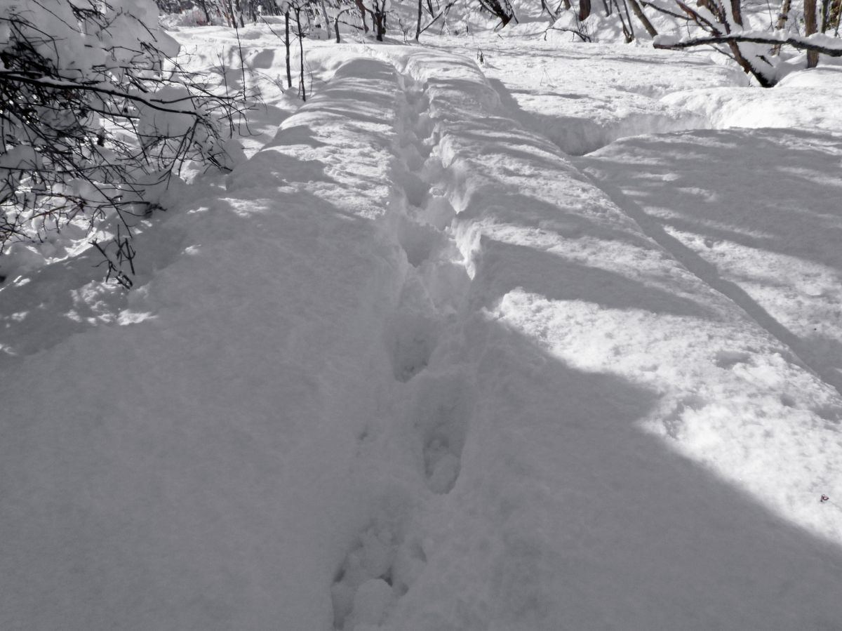 私の前に、誰かが足を踏み入れた跡がありましたが、余りの積雪量に数mで断念して引き返していました。