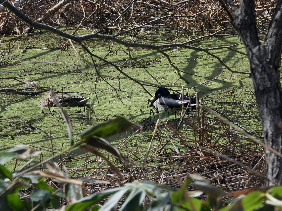 マガモのつがいが、第一駐車場下の湿原で採餌をしていました。(写真4)