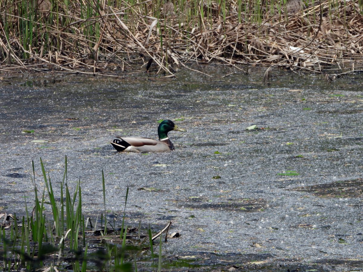 人工池ではマガモの雄が1羽採餌をしていましたが、撮影中に飛び去ってしまいました。(写真1)