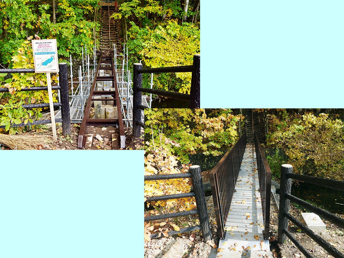 以前の橋は中央の手摺りの両側を通行可能でしたが、今回は半分の幅になりました。