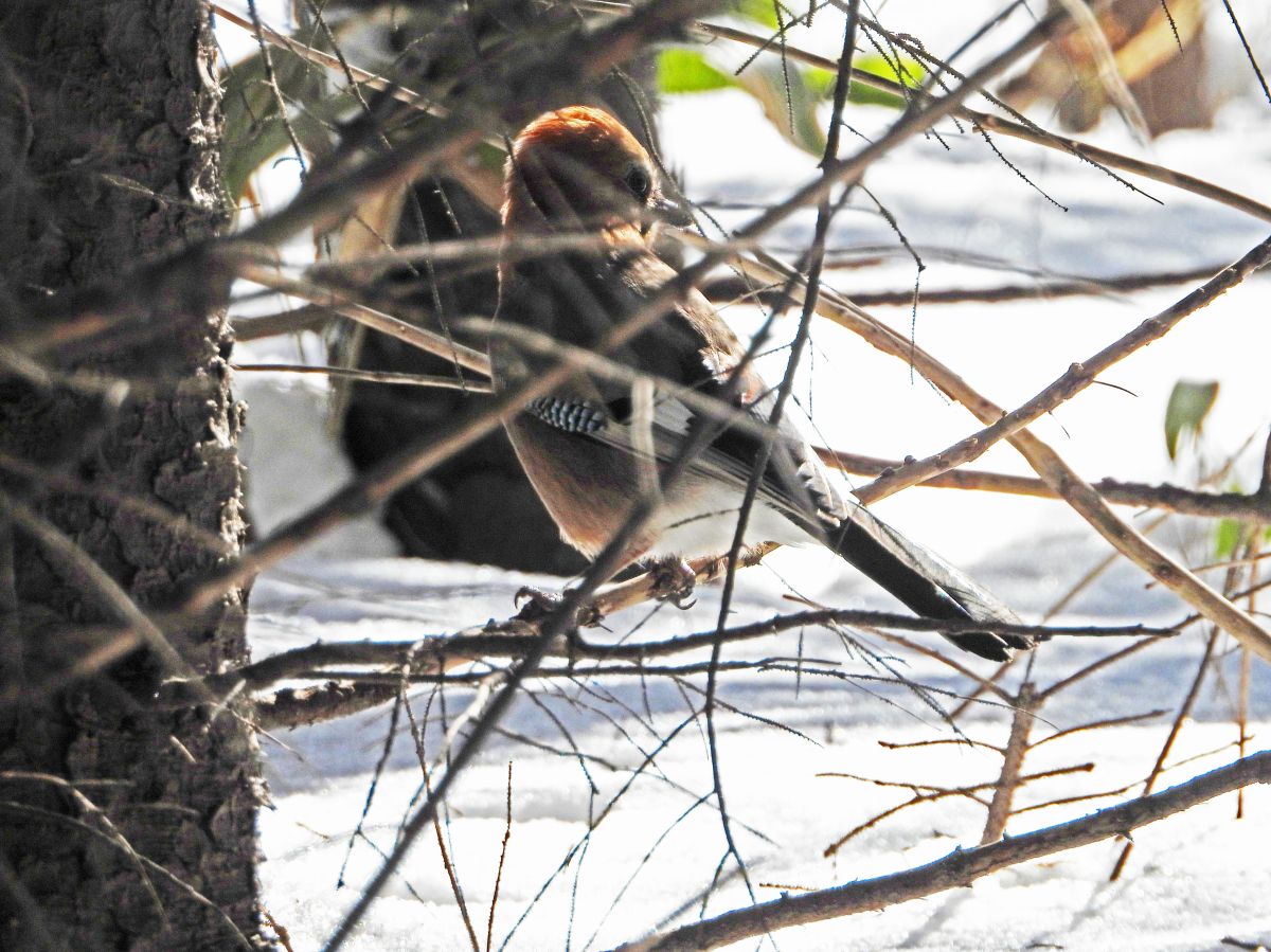 カケスは、木々の枝の濃い場所で採餌をしていたので、綺麗な写真にはなりませんでした。