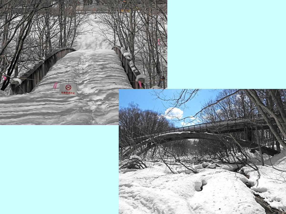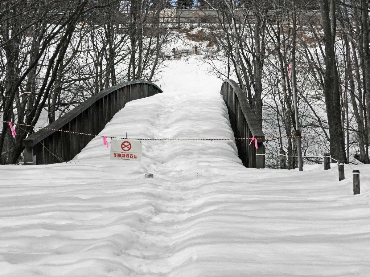 梅の香橋上の積雪が減ってきていますが、欄干に接している路盤の一部で積雪が消えています。(写真8)