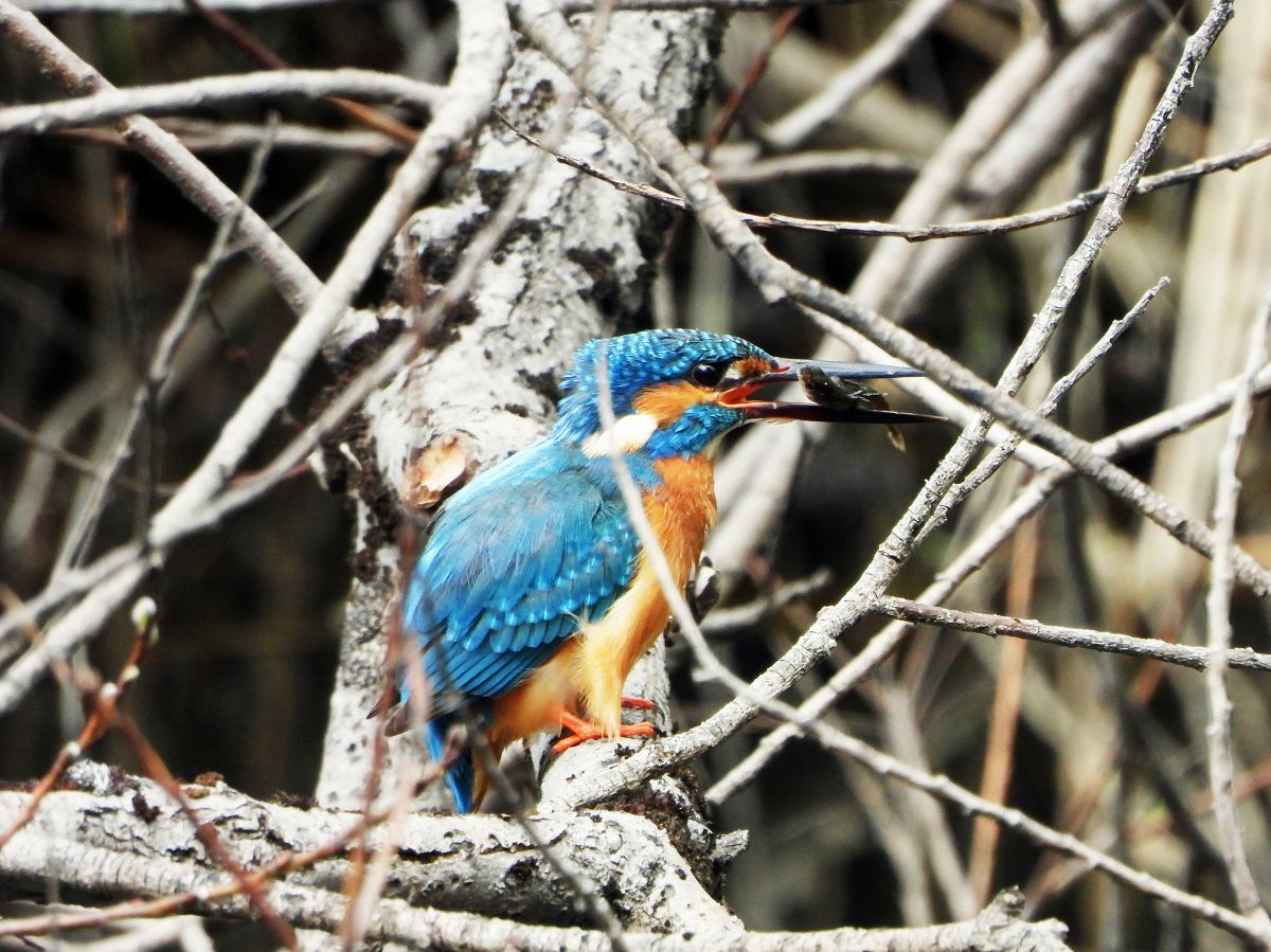 カワセミは、撮影の直前に小魚を捕らえていたようで、中島の木にとまって小魚をのみこみました。