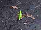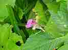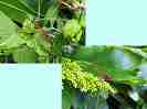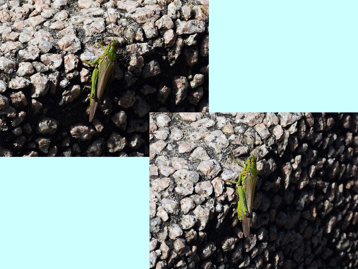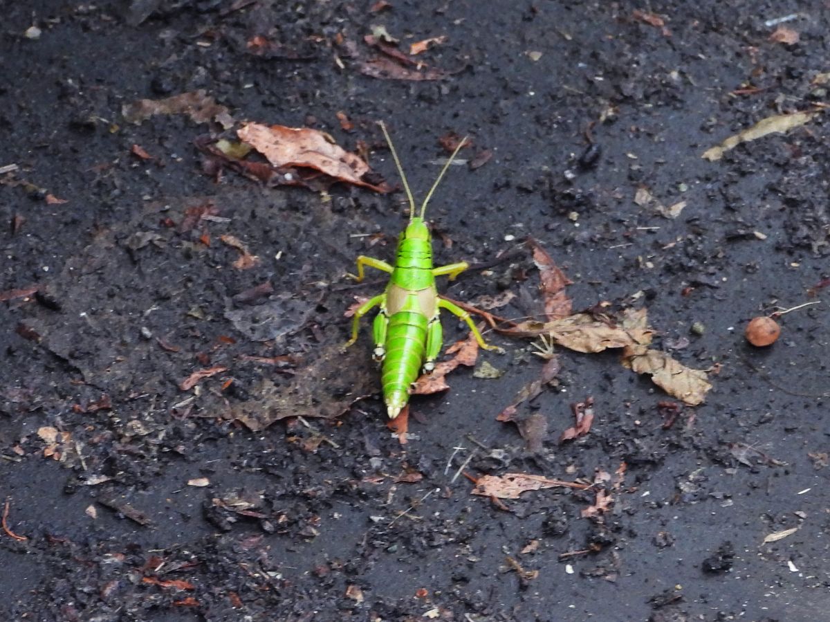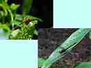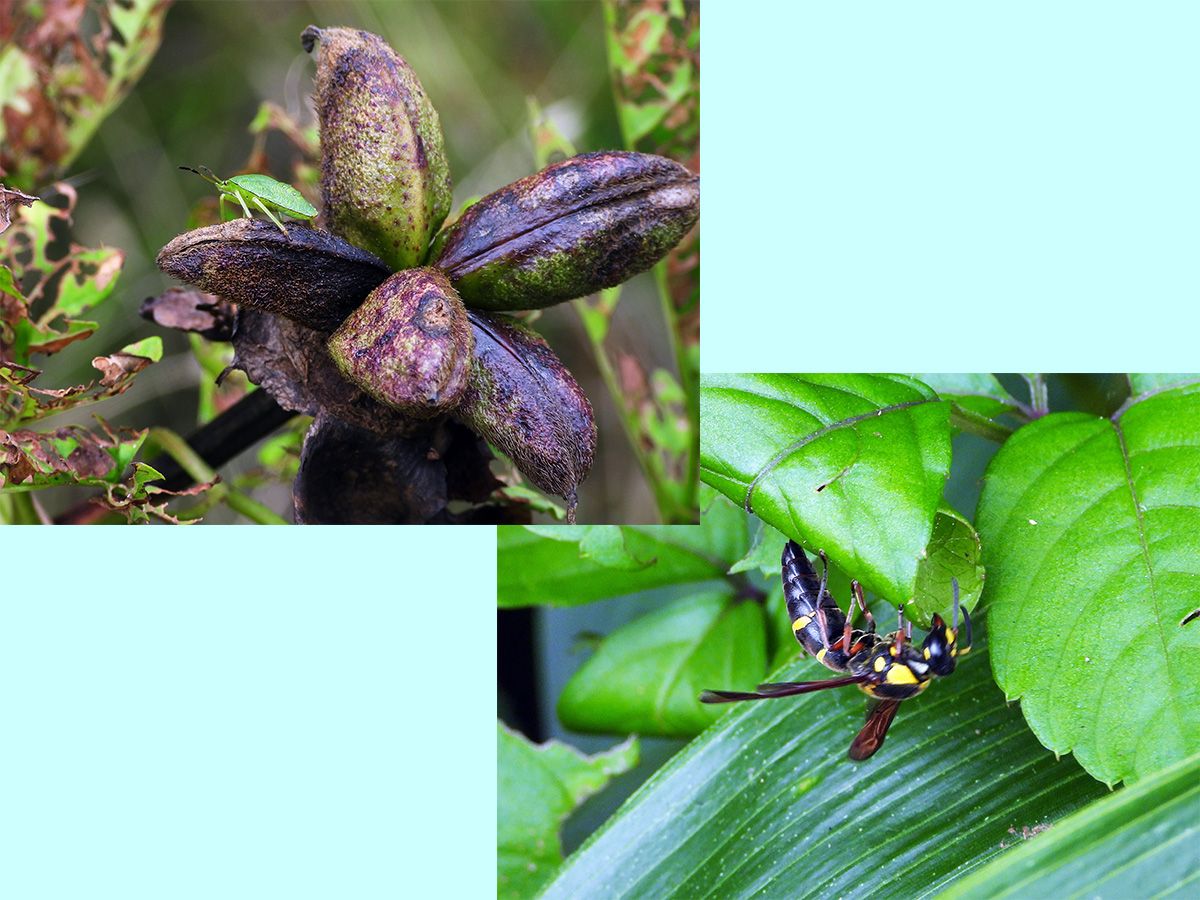 写真2:上段は、シャクナゲの子房ですが、普段あまり見かけない緑色の昆虫がいました。