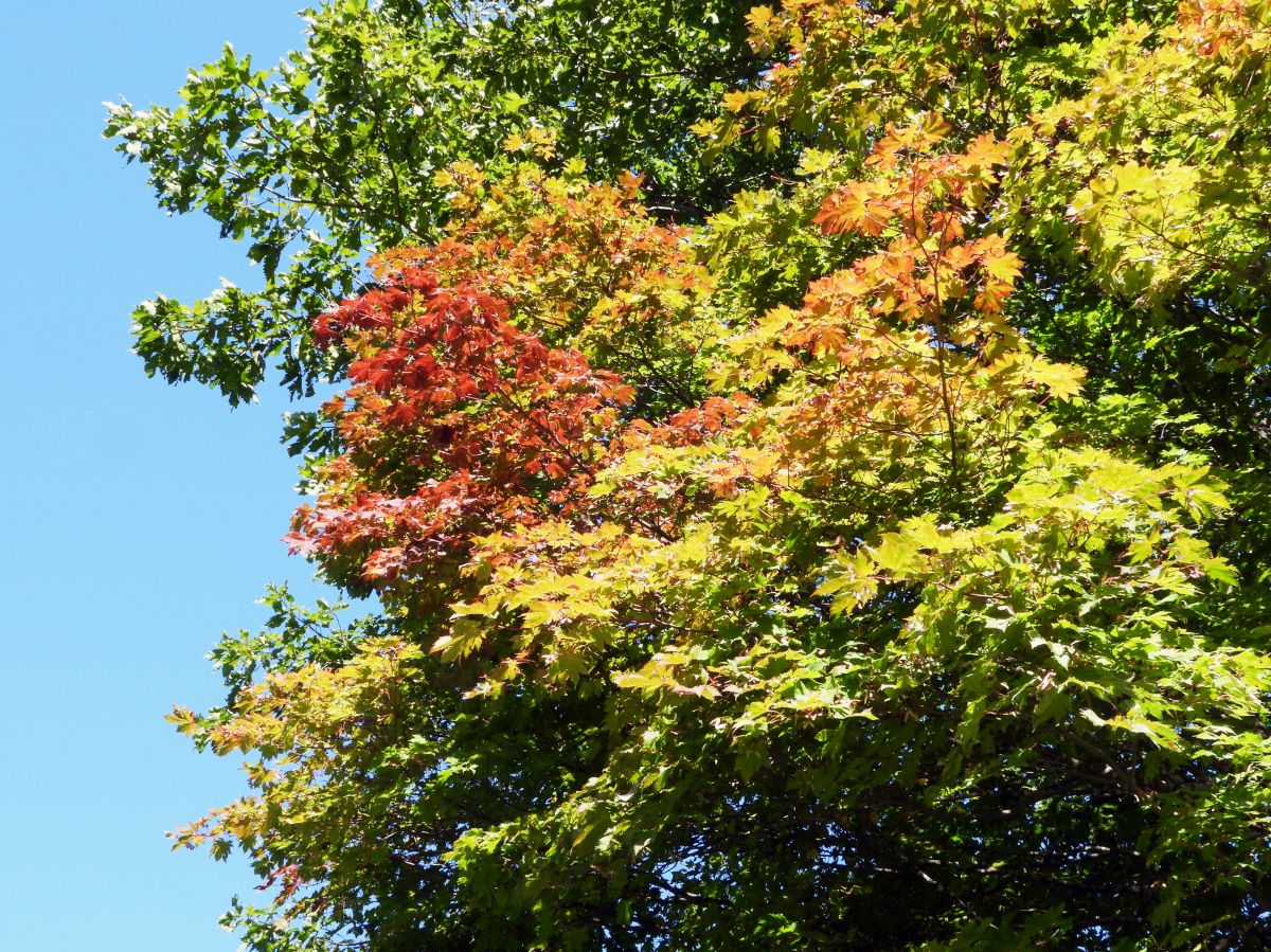 梅園の斜面の上のモミジの一部が紅葉しました。
