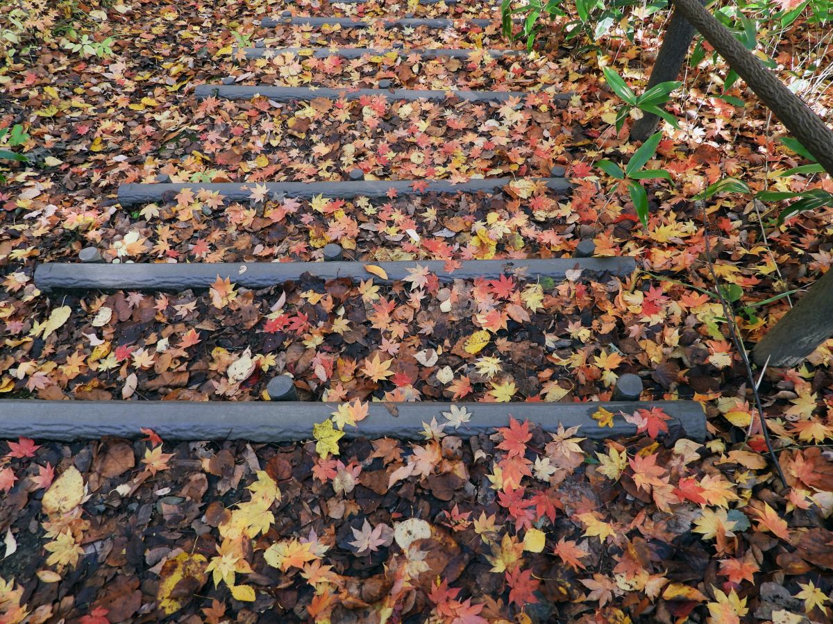 第一駐車場から湿原に降りる急な階段では、真上にモミジの木があるので、いま現在落ち葉が大変素敵です。(写真5)