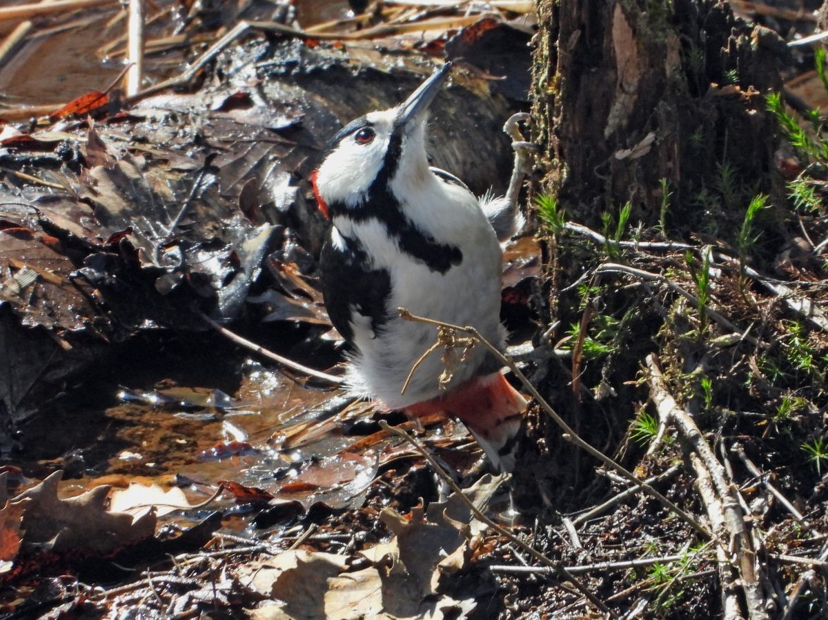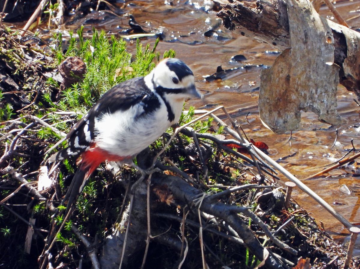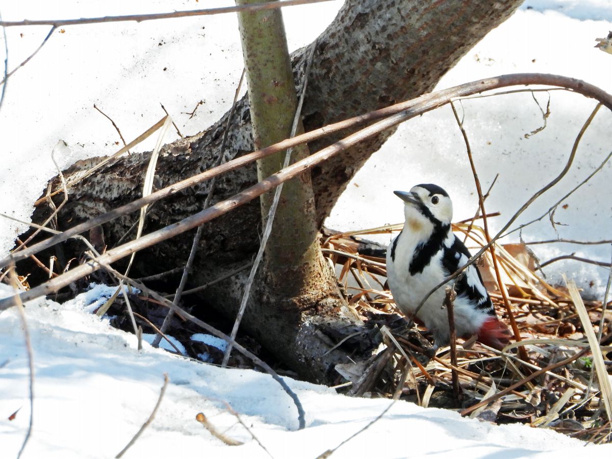 最後に、梅の香橋の上から湿原を観察しているときに、採餌中のアカゲラを発見しました。(写真5〜9)