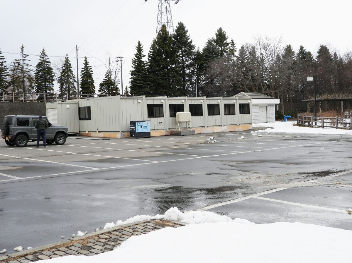 第一駐車場に冬期間設置される除雪センターは、すでに業務を終了しており、今日は駐車場の機械除雪が行われていました。(写真1)