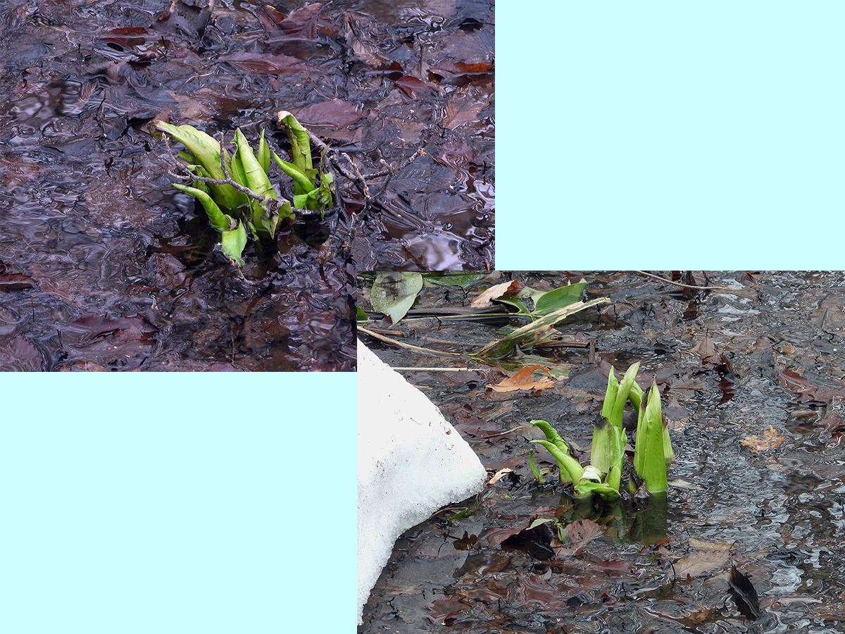 梅の香橋付近の湿原で、雪に隠れていた水芭蕉が姿を見せはじめました。(写真6)