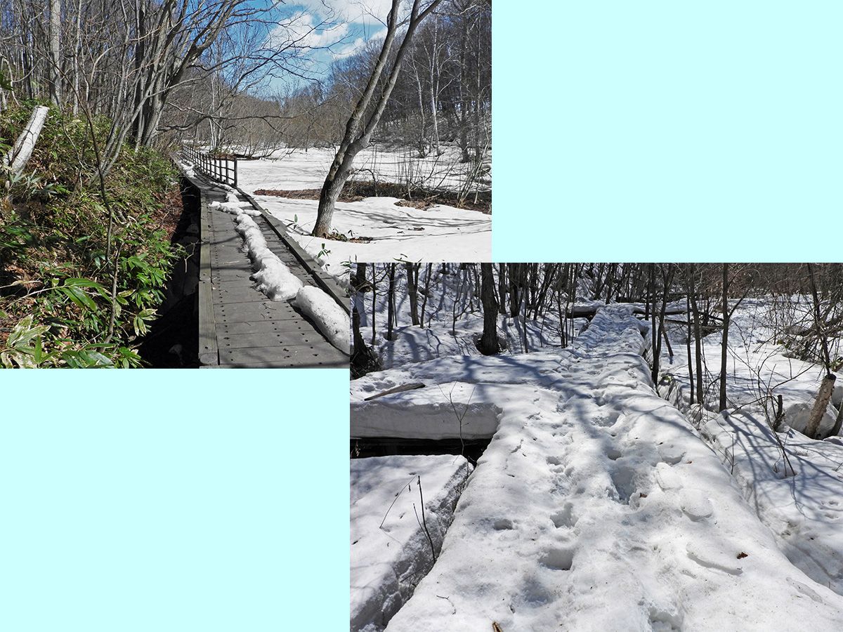 湿原の木道は、陽当たりの良い部分(全体の4分の1程度)は、かなり雪解けが進んでいます。(写真3)