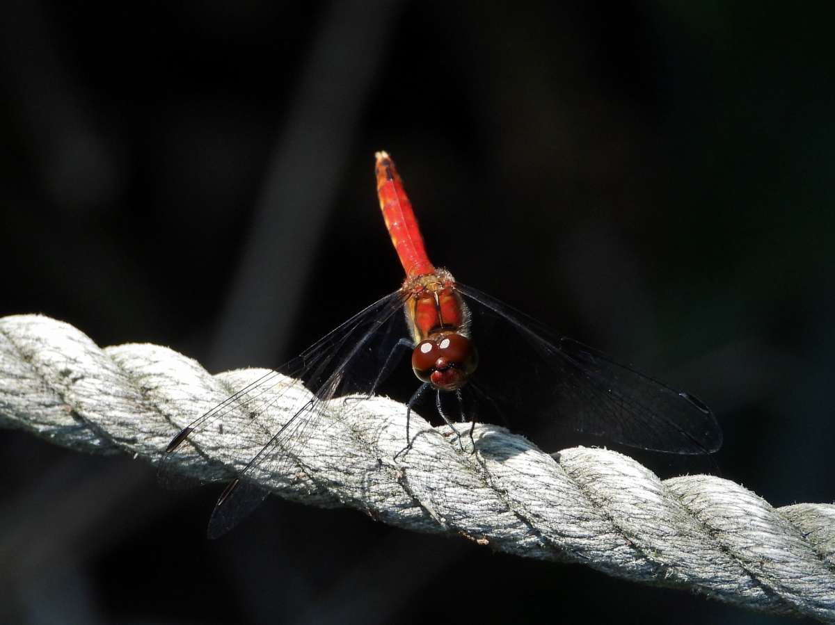 ロープや植物の茎の先端などで、多数のトンボが羽根を休めています。