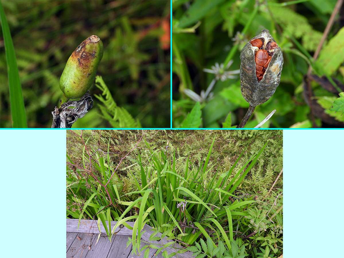 ハナショウブに似た花が終了して、子房が成長して種子がはじけそうになりました。(写真9:上段)