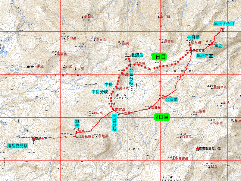 GPS記録: 1日目(旭岳→黒岳):なし。 2日目(黒岳→旭岳):あり・良好